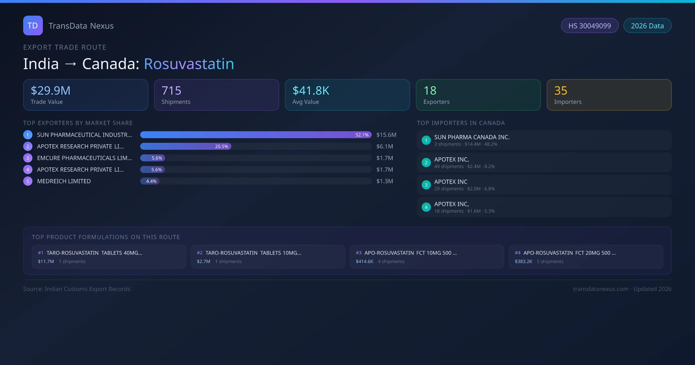 On the buying side, SUN PHARMA CANADA INC. is the largest importer with 2 shipments worth $14.4M USD — representing 48% of all rosuvastatin imports from India on this route. A total of 35 buyers are active on this corridor.
