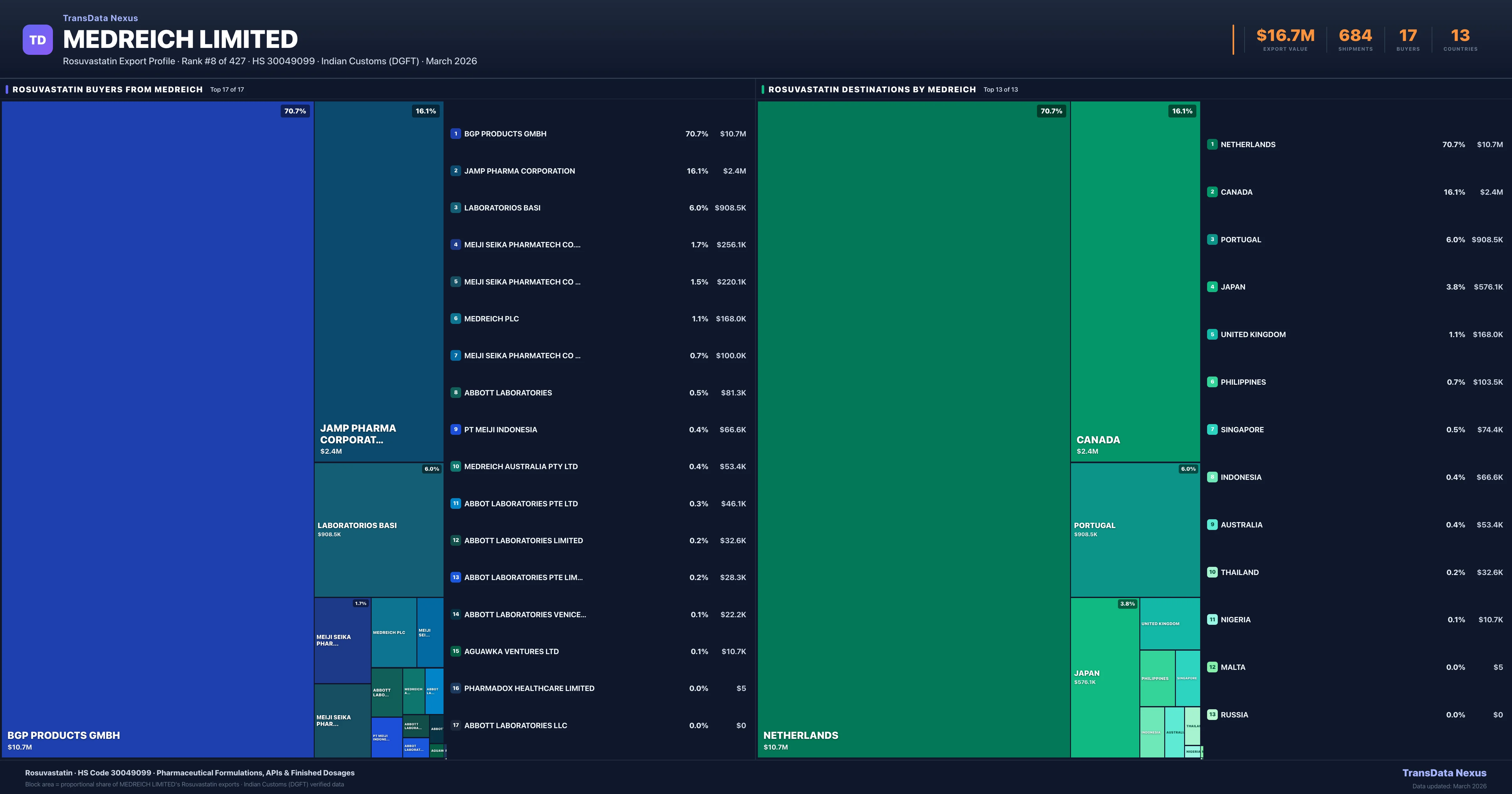 Medreich Limited's average Rosuvastatin shipment value is $24.5K per consignment, based on 684 shipments totaling $16.7M. The largest destination is NETHERLANDS (70.7% of Medreich Limited's Rosuvastatin exports).
