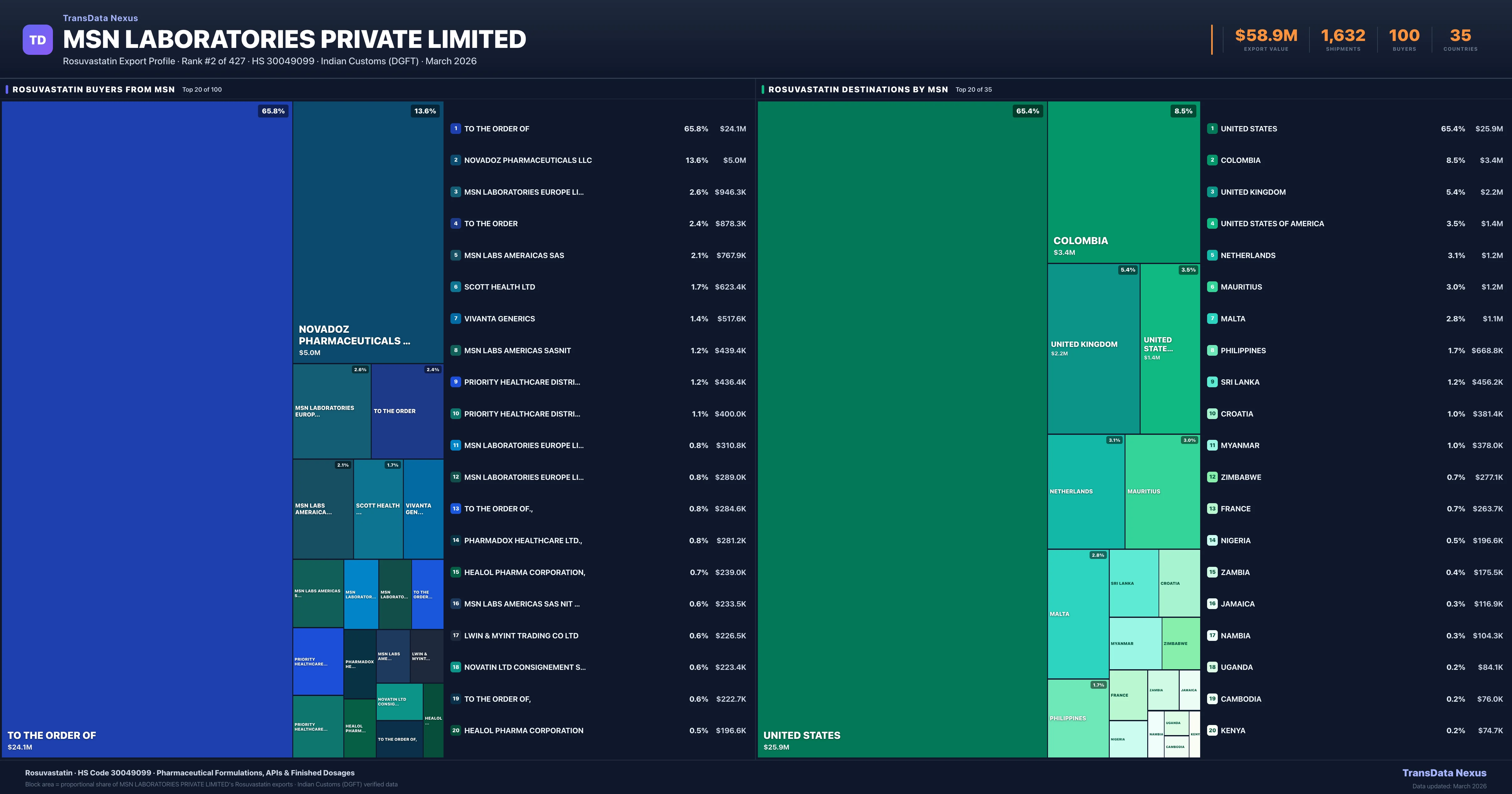 - 4.Verified Records: This page is backed by 1,632 individual customs records matching MSN Laboratories Private Limited exporting Rosuvastatin, covering 600 formulations to 35 countries via 100 buyers.