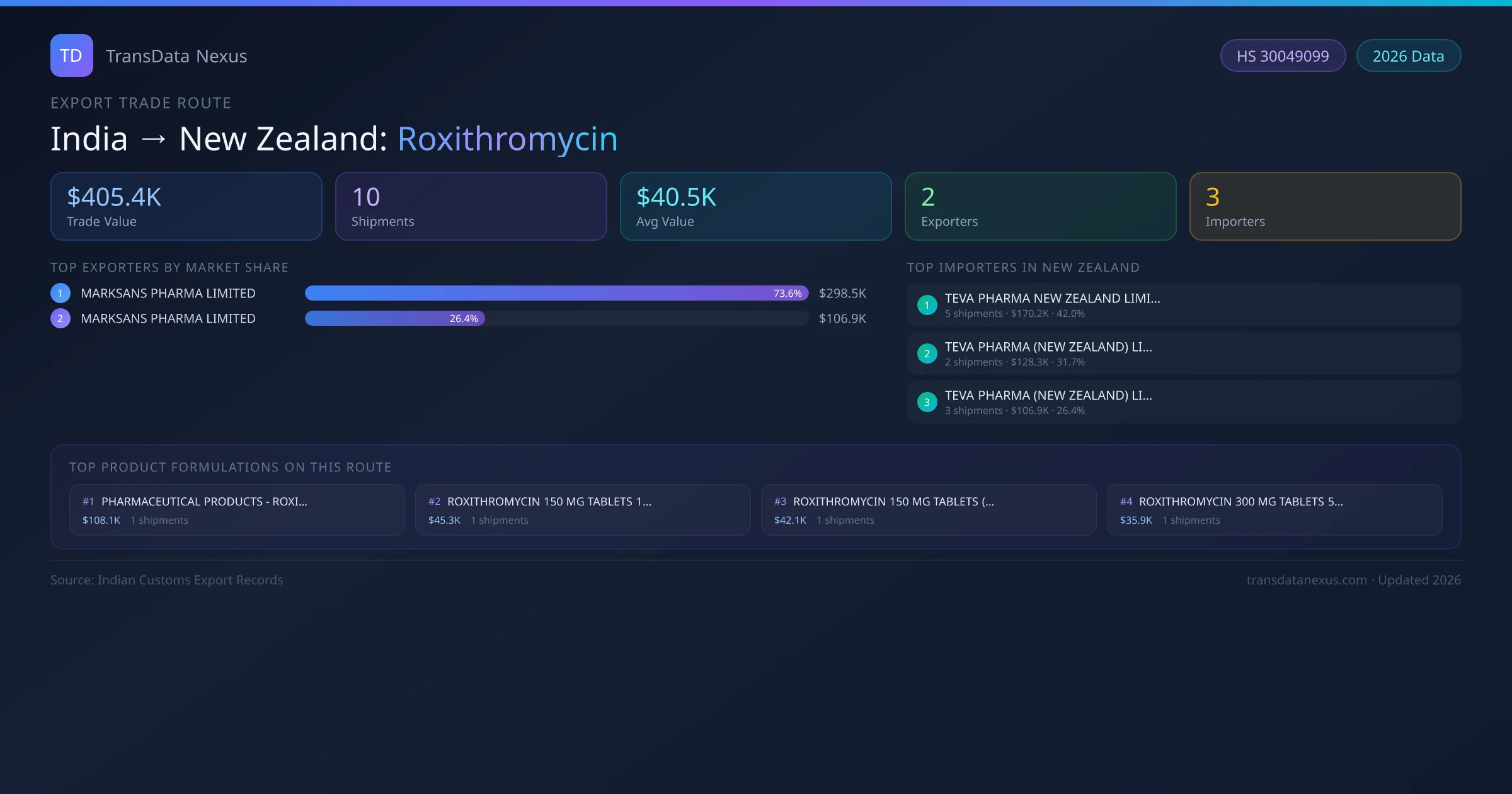 The India to New Zealand Roxithromycin corridor is one of India's established pharmaceutical export routes, with 10 shipments documented worth a combined $405.4K USD. The route is dominated by MARKSANS PHARMA LIMITED, which alone accounts for roughly 74% of all export value, reflecting the consolidated nature of India's roxithromycin manufacturing sector.