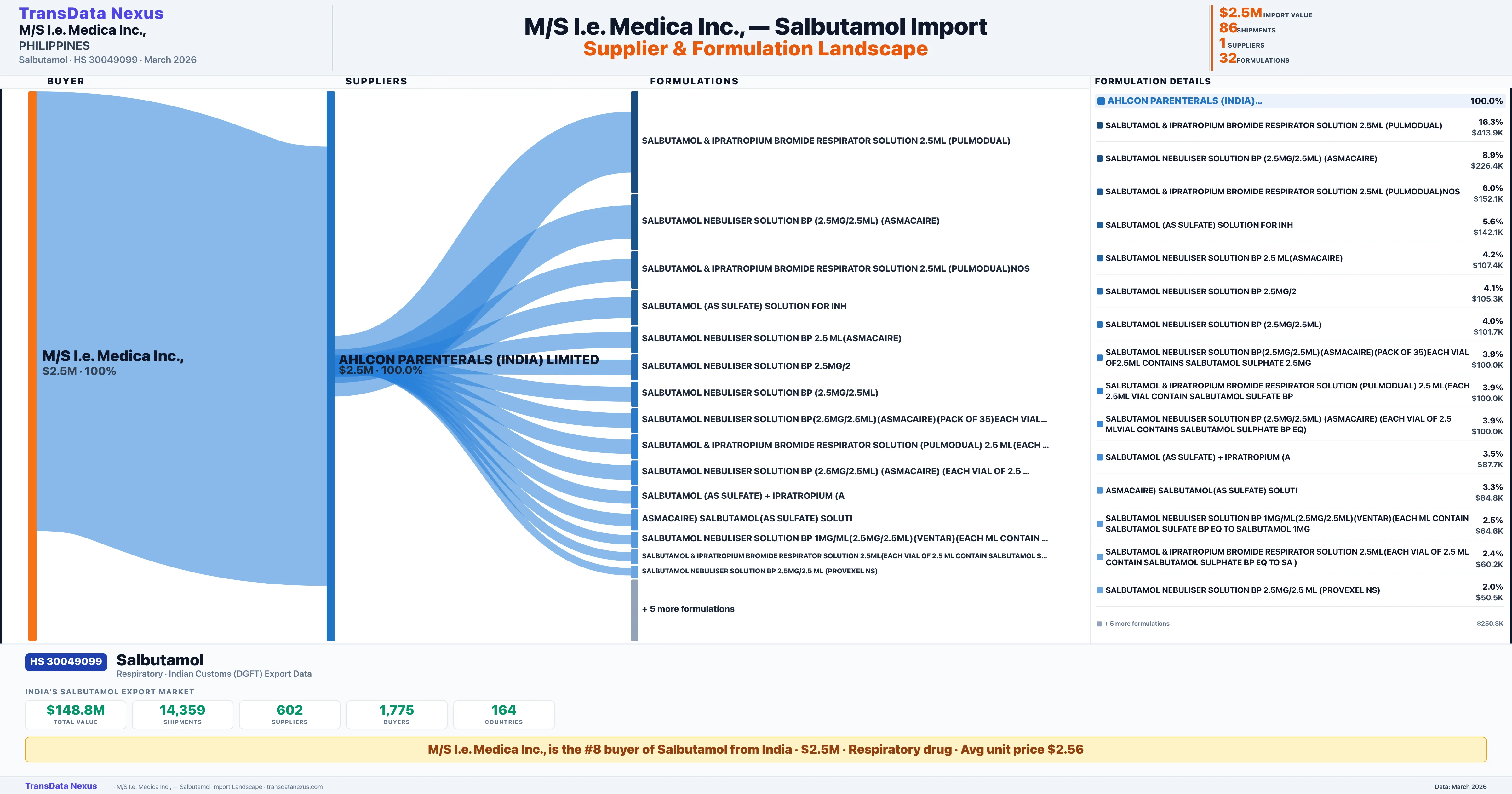 M/S I.E. MEDICA INC., imports 32 distinct Salbutamol formulations from India. The top formulation is SALBUTAMOL & IPRATROPIUM BROMIDE RESPIRATOR SOLUTION 2.5ML ( with 11 shipments worth $413.9K.