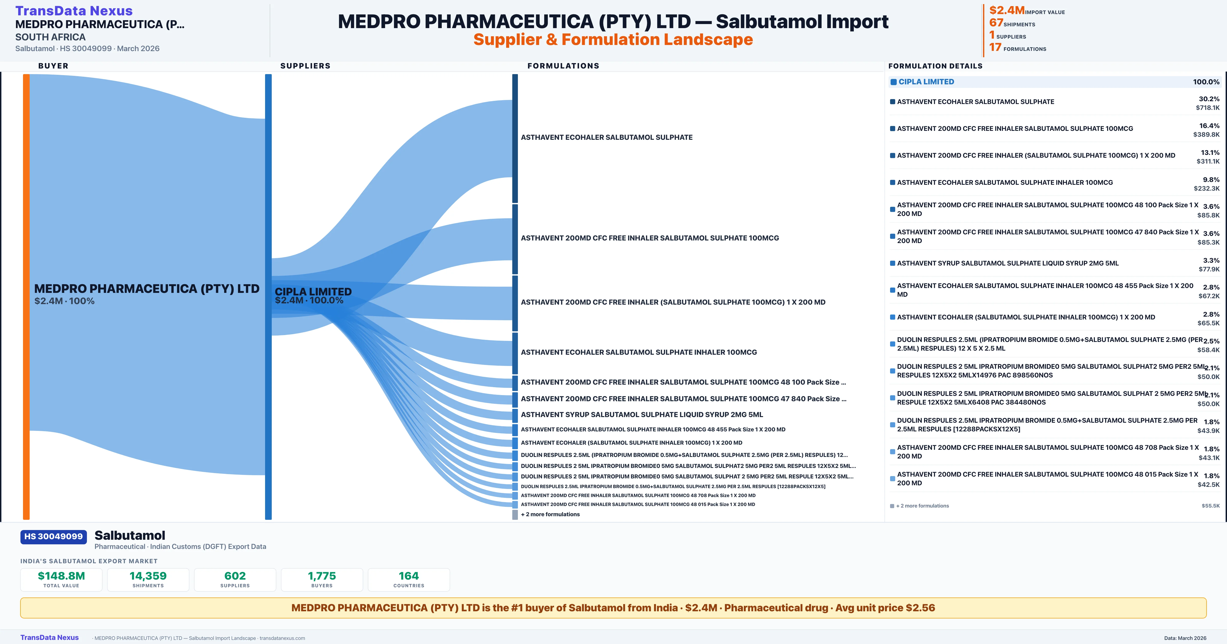 MEDPRO PHARMACEUTICA (PTY) LTD sources Salbutamol from 1 verified Indian supplier: CIPLA LIMITED ($2.4M, 100.0%). This is based on 67 customs records.