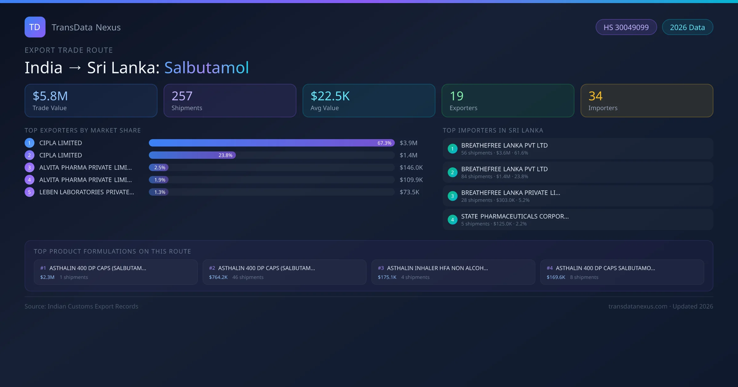The India to Sri Lanka Salbutamol corridor is one of India's established pharmaceutical export routes, with 257 shipments documented worth a combined $5.8M USD. The route is dominated by CIPLA LIMITED, which alone accounts for roughly 67% of all export value, reflecting the consolidated nature of India's salbutamol manufacturing sector.