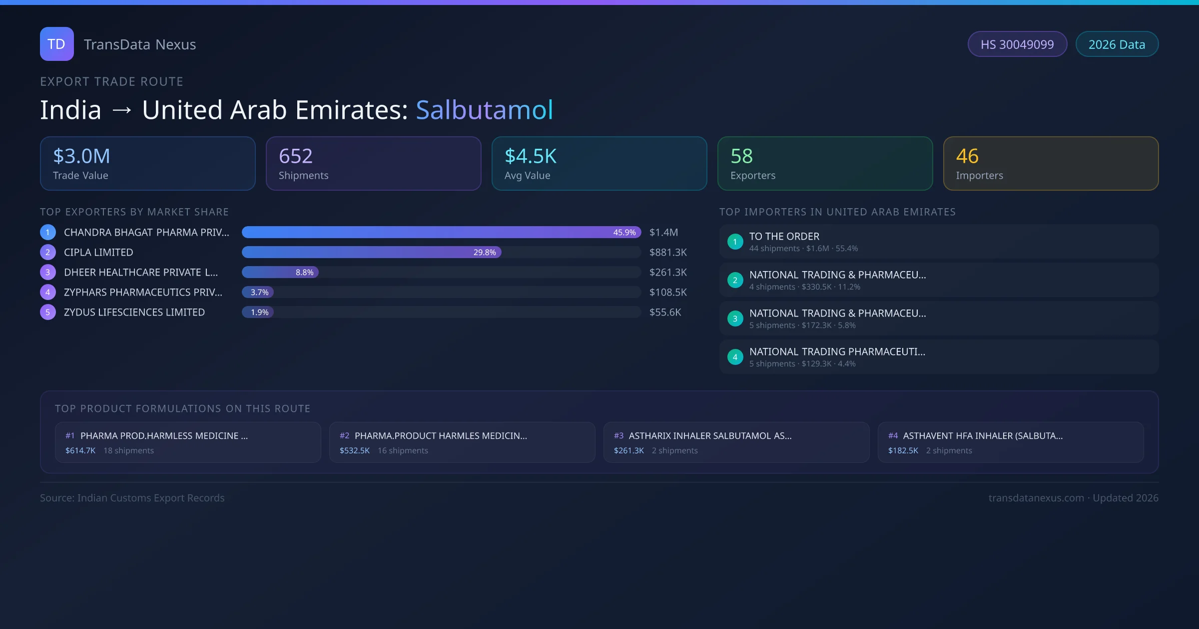 - 1.Route Identification: India to United Arab Emirates export trade corridor identified from Indian Customs (DGFT) records for Salbutamol.