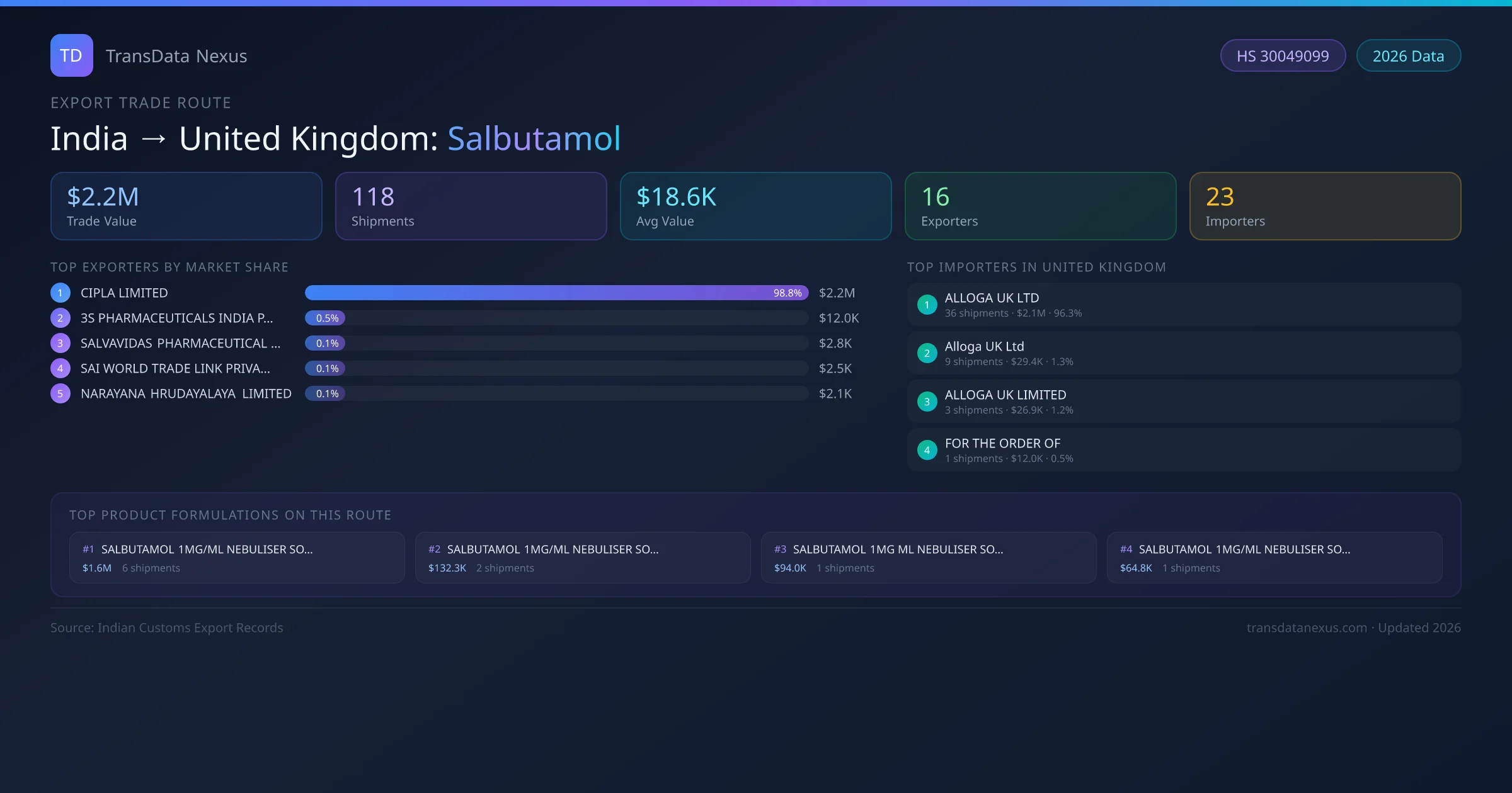 India has recorded 118 verified shipments of Salbutamol exported to United Kingdom, representing a combined trade value of $2.2M USD. This corridor is served by 16 active Indian exporters, with an average shipment value of $18.6K USD. The leading Indian exporter is CIPLA LIMITED, which accounts for 99% of total export value with 48 shipments worth $2.2M USD. On the buying side, ALLOGA UK LTD is the largest importer in United Kingdom with $2.1M USD in purchases. The top 3 suppliers — CIPLA LIMITED, 3S PHARMACEUTICALS INDIA PRIVATE LIMITED, SALVAVIDAS PHARMACEUTICAL PRIVATE LIMITED — together control 99% of total trade value on this route. All data sourced from Indian Customs (DGFT) shipping bill records. Values reported in FOB USD.