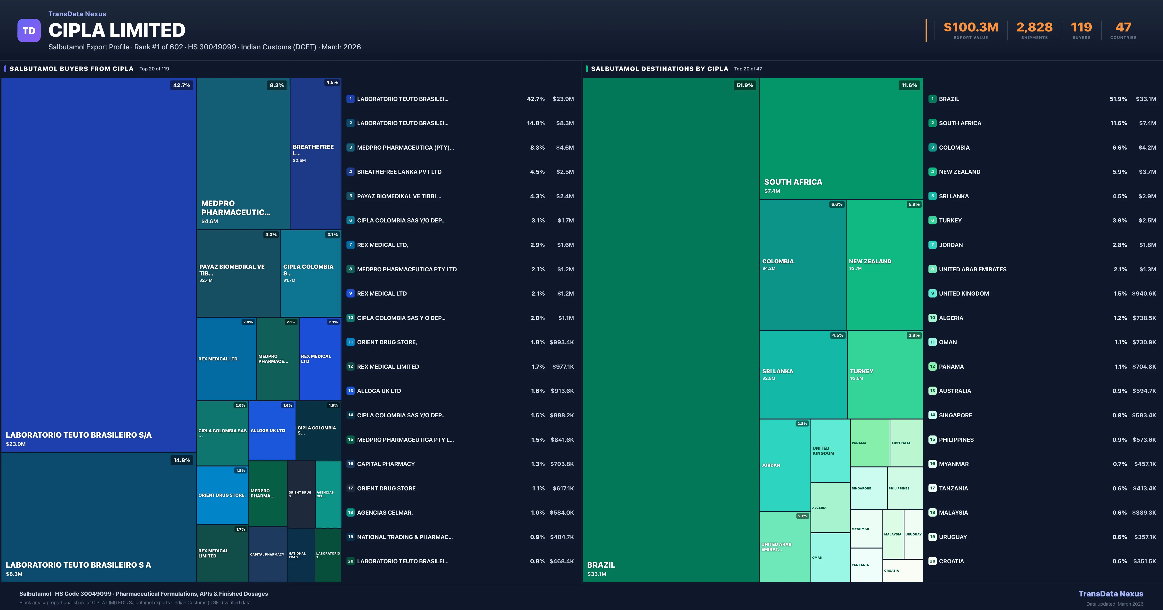 Cipla Limited is the #1 Indian exporter of Salbutamol with $100.3M in export value and 2,828 verified shipments. Cipla Limited holds a 67.4% market share in Salbutamol exports across 41 countries. The company exports 98 pharmaceutical products worth $1.1B across 26 therapeutic categories.