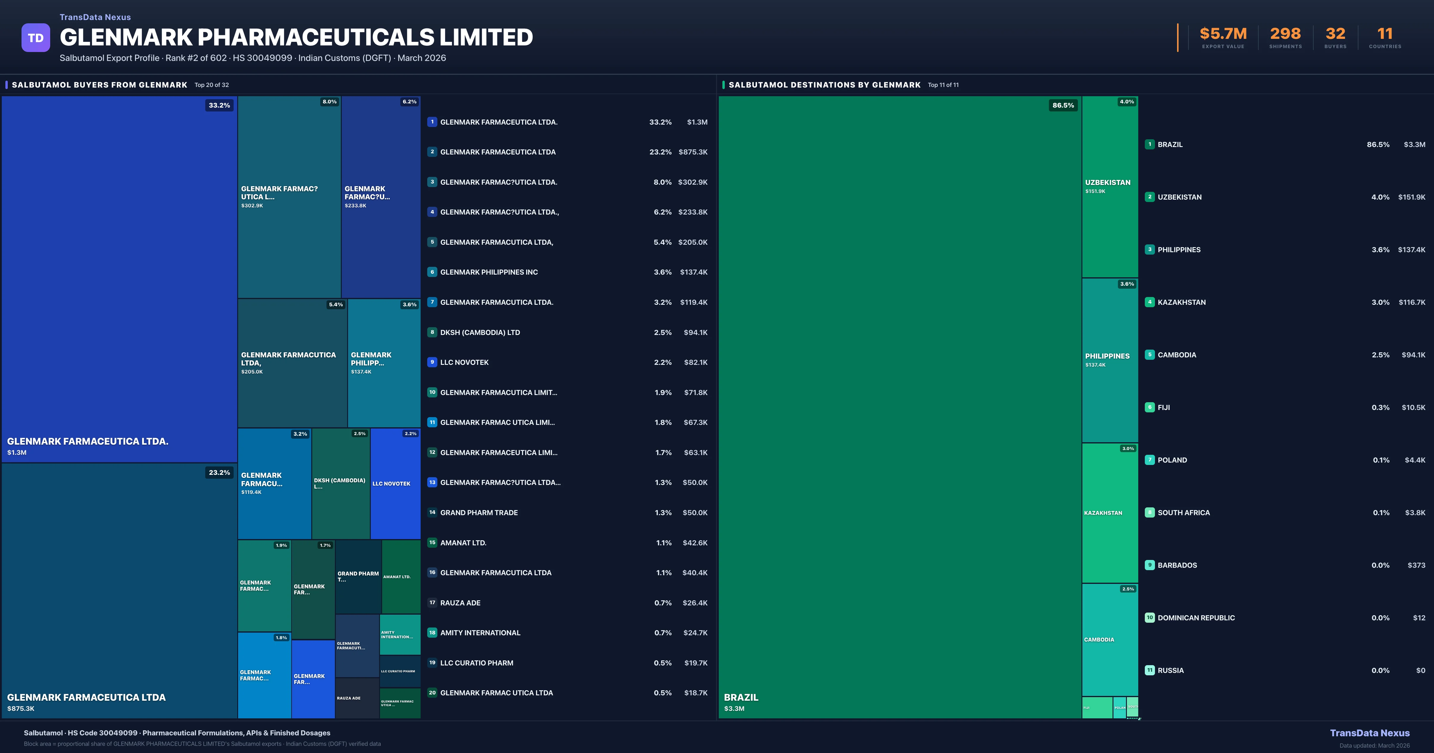 Glenmark Pharmaceuticals Limited supplies Salbutamol to 32 buyers globally. The largest buyer is GLENMARK FARMACEUTICA LTDA. (BRAZIL), followed by GLENMARK FARMACEUTICA LTDA (BRAZIL) and GLENMARK FARMAC?UTICA LTDA. (BRAZIL). These buyers represent pharmaceutical distributors, hospital groups, and government procurement agencies in their respective markets.