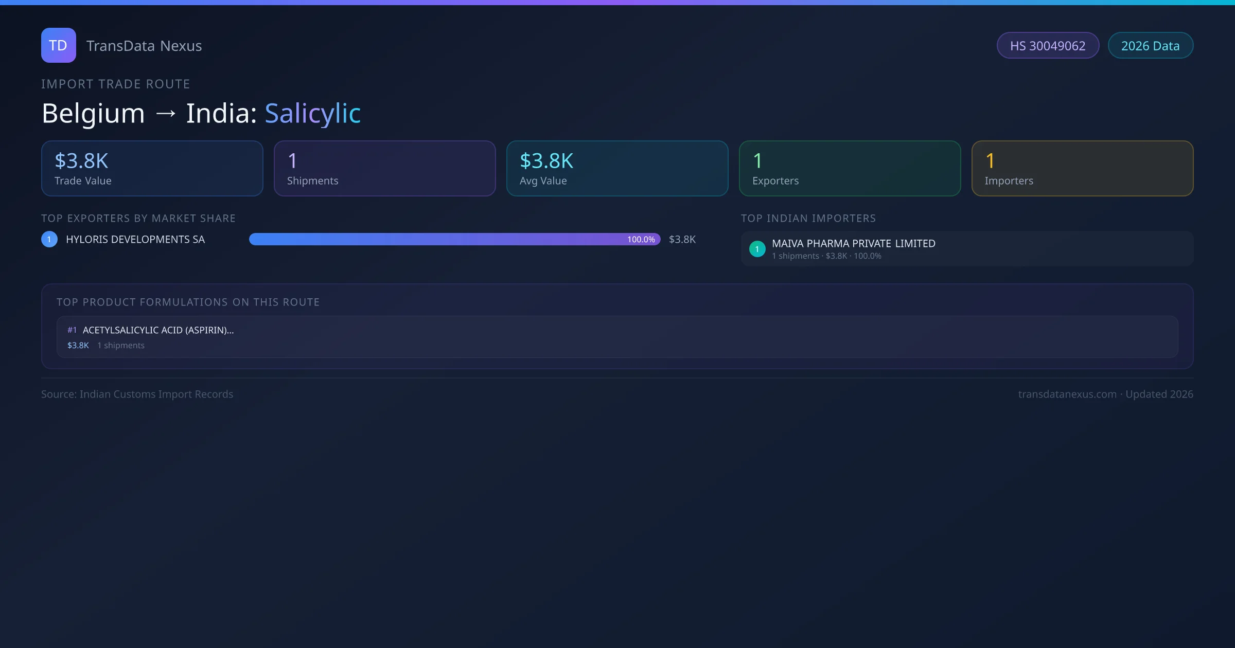 On the buying side, MAIVA PHARMA PRIVATE LIMITED is the largest importer with 1 shipments worth $3.8K USD — representing 100% of all salicylic imports from Belgium on this route.