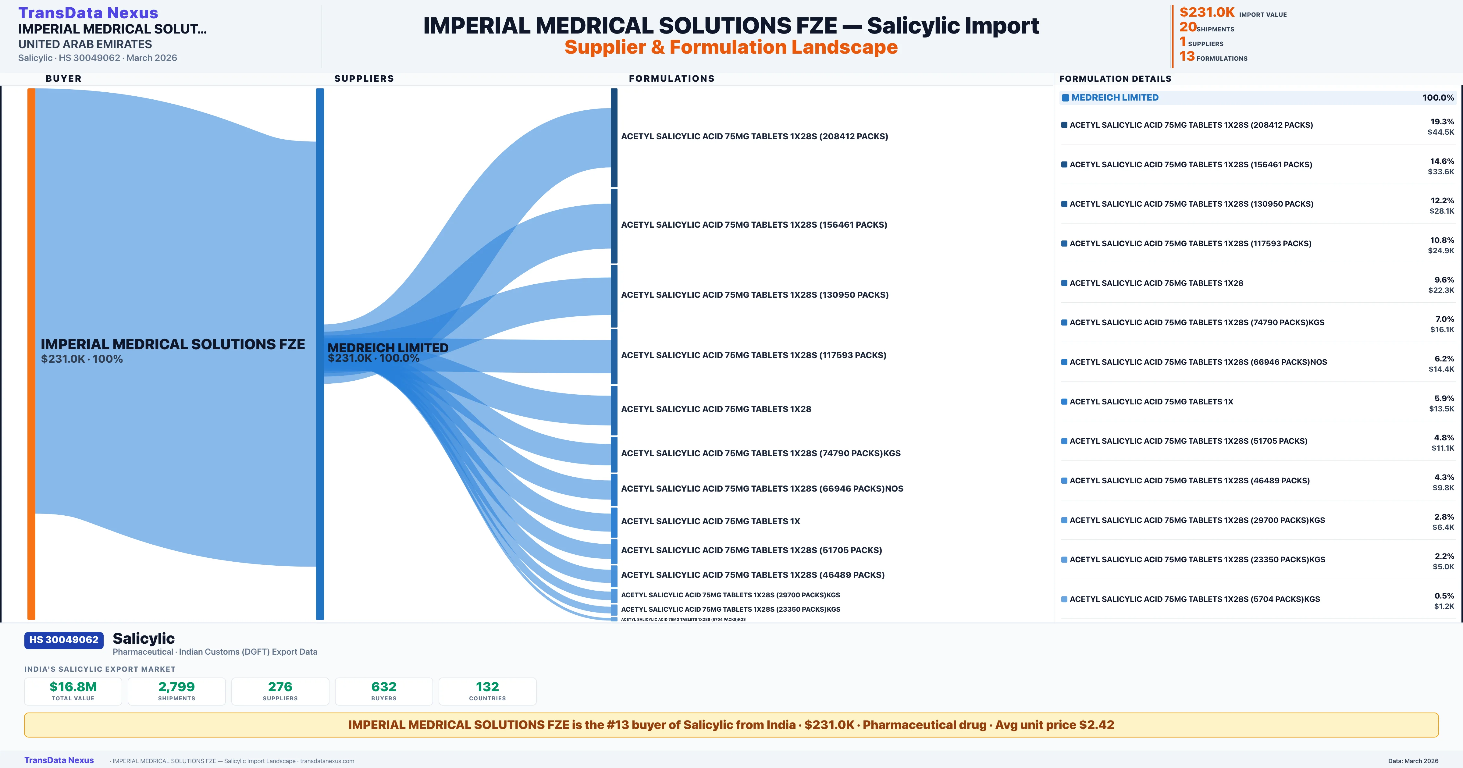 IMPERIAL MEDRICAL SOLUTIONS FZE sources Salicylic from 1 verified Indian supplier: MEDREICH LIMITED ($231.0K, 100.0%). This is based on 20 customs records.