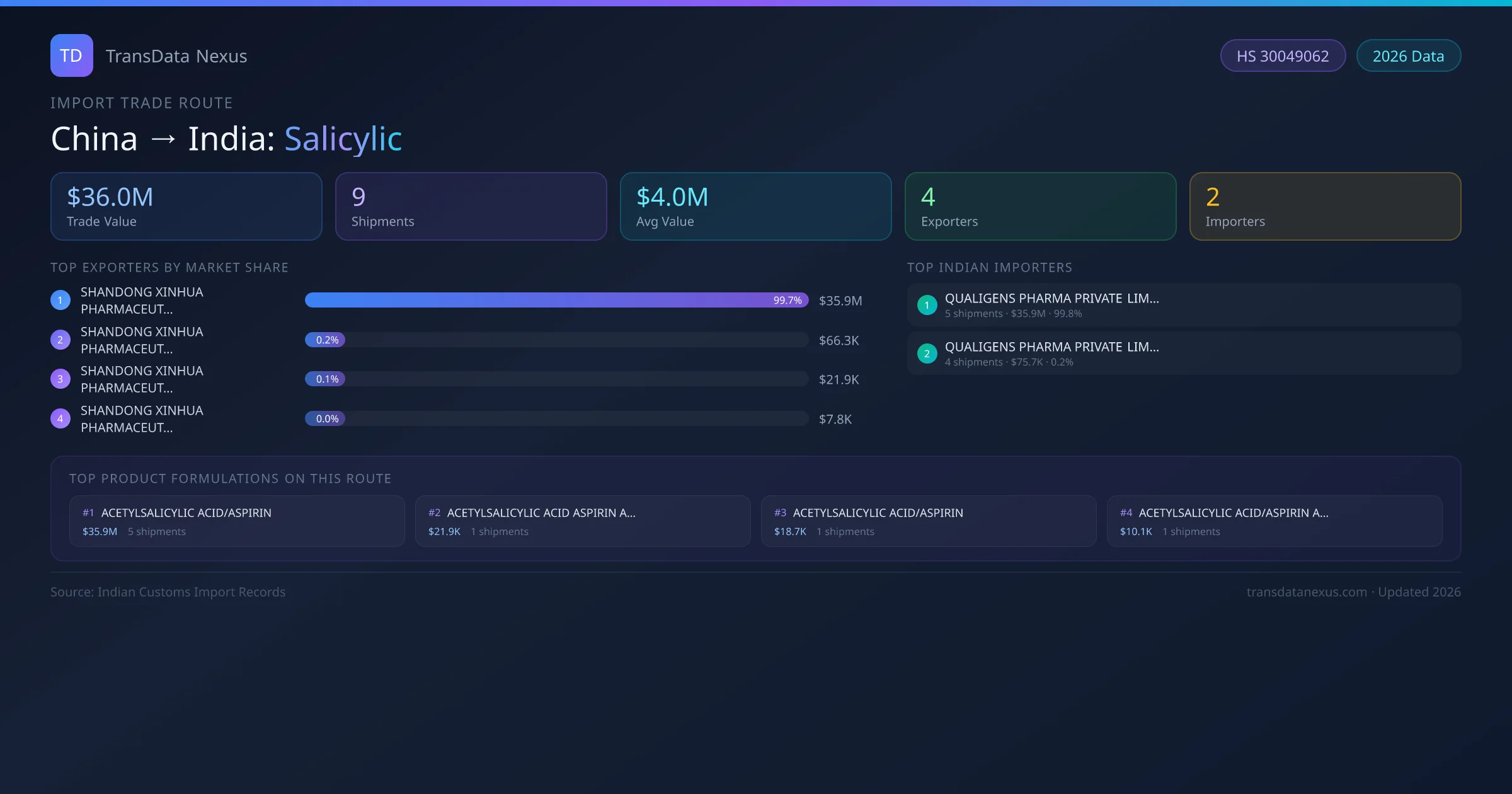 The China to India Salicylic corridor is one of India's established pharmaceutical import routes from China, with 9 shipments documented worth a combined $36.0M USD. The route is dominated by SHANDONG XINHUA PHARMACEUTICAL CO., LTD. , which alone accounts for roughly 100% of all import value, reflecting the consolidated nature of China's salicylic export sector.