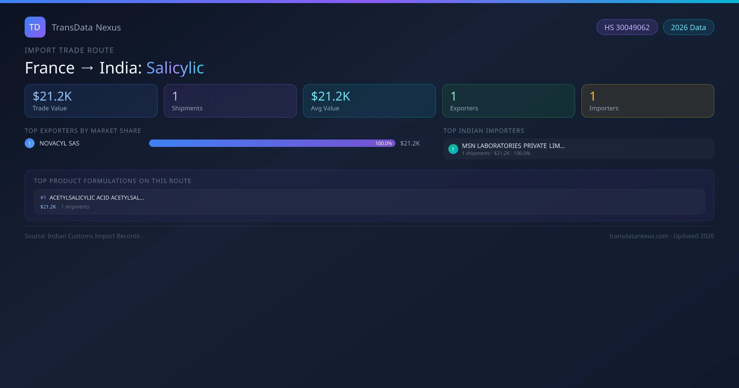On the buying side, MSN LABORATORIES PRIVATE LIMITED is the largest importer with 1 shipments worth $21.2K USD — representing 100% of all salicylic imports from France on this route.