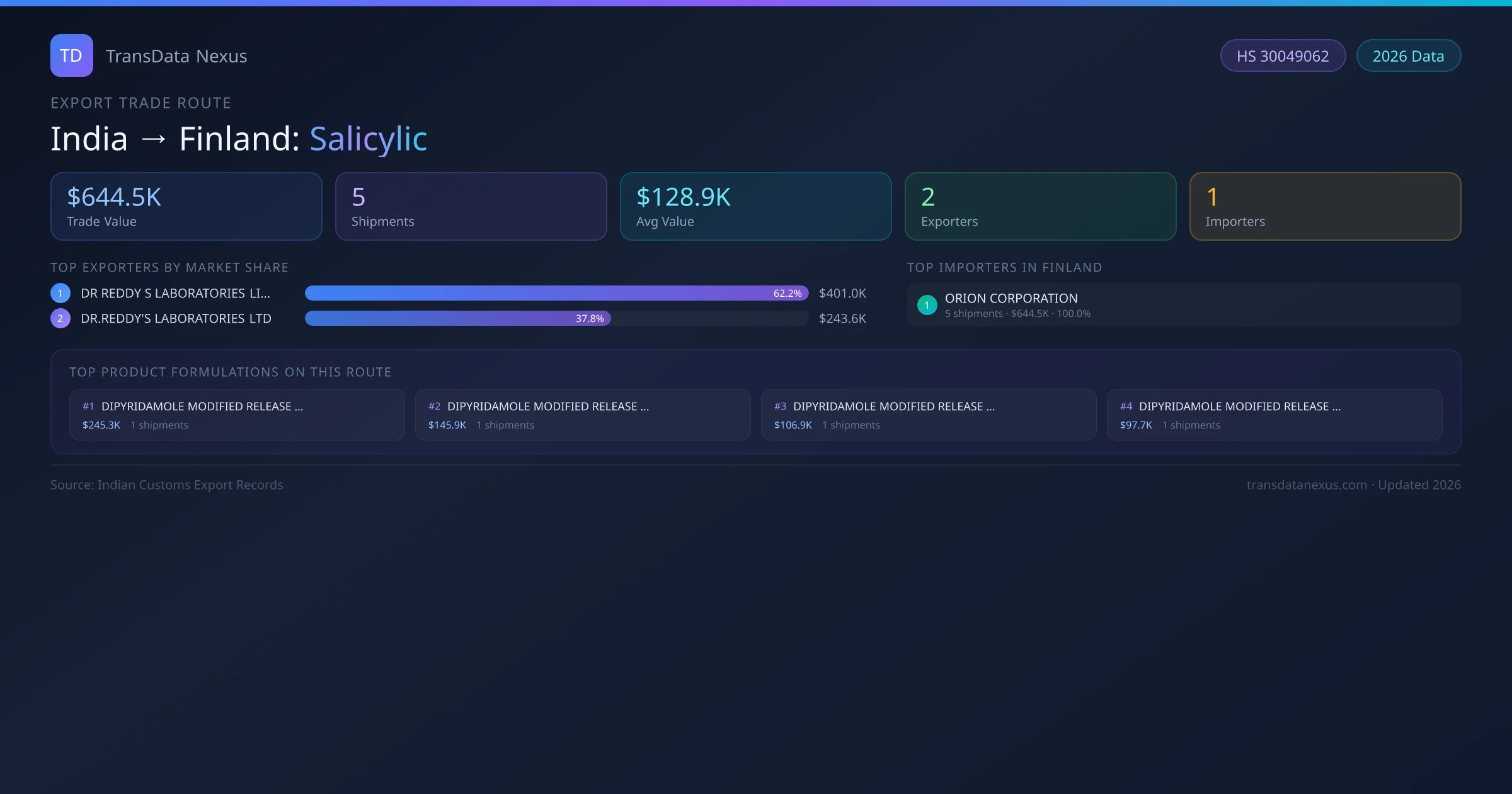 India has recorded 5 verified shipments of Salicylic exported to Finland, representing a combined trade value of $644.5K USD. This corridor is served by 2 active Indian exporters, with an average shipment value of $128.9K USD. The leading Indian exporter is DR REDDY S LABORATORIES LIMITED, which accounts for 62% of total export value with 3 shipments worth $401.0K USD. On the buying side, ORION CORPORATION is the largest importer in Finland with $644.5K USD in purchases. All data sourced from Indian Customs (DGFT) shipping bill records. Values reported in FOB USD.