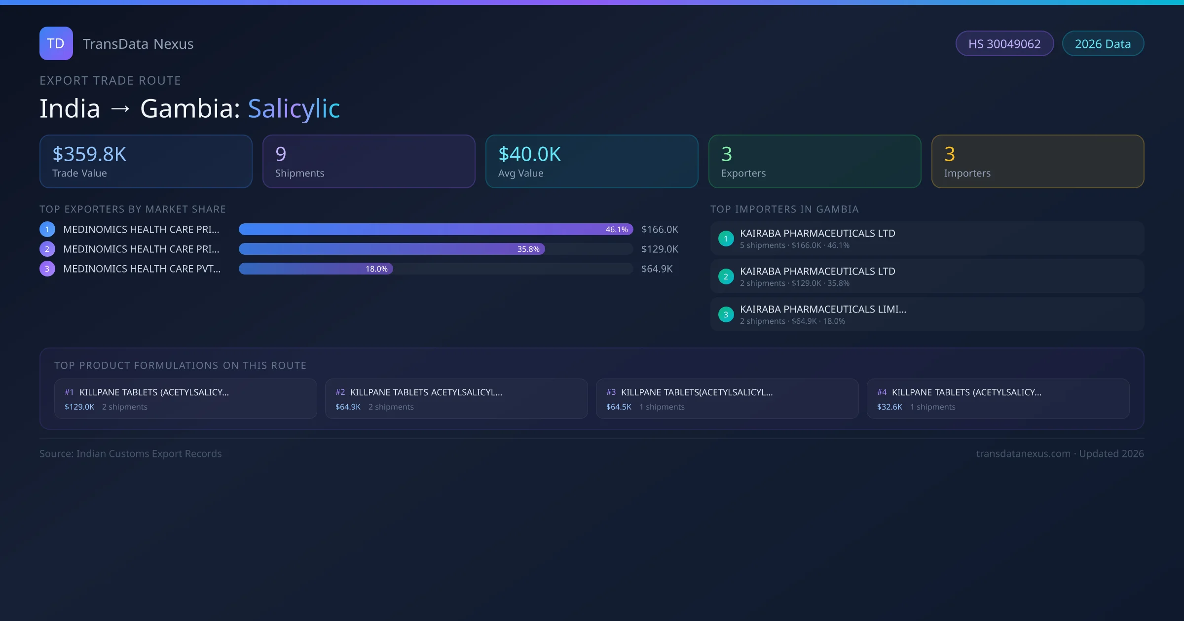 The India to Gambia Salicylic corridor is one of India's established pharmaceutical export routes, with 9 shipments documented worth a combined $359.8K USD. The route is dominated by MEDINOMICS HEALTH CARE PRIVATE LIMITED, which alone accounts for roughly 46% of all export value, reflecting the consolidated nature of India's salicylic manufacturing sector.