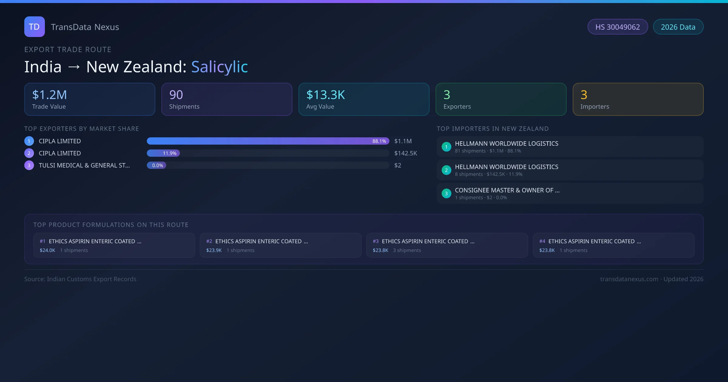 The leading Indian exporters of Salicylic to New Zealand are CIPLA LIMITED, CIPLA LIMITED , TULSI MEDICAL & GENERAL STORES. CIPLA LIMITED holds the largest market share at approximately 88% of total trade value on this route.