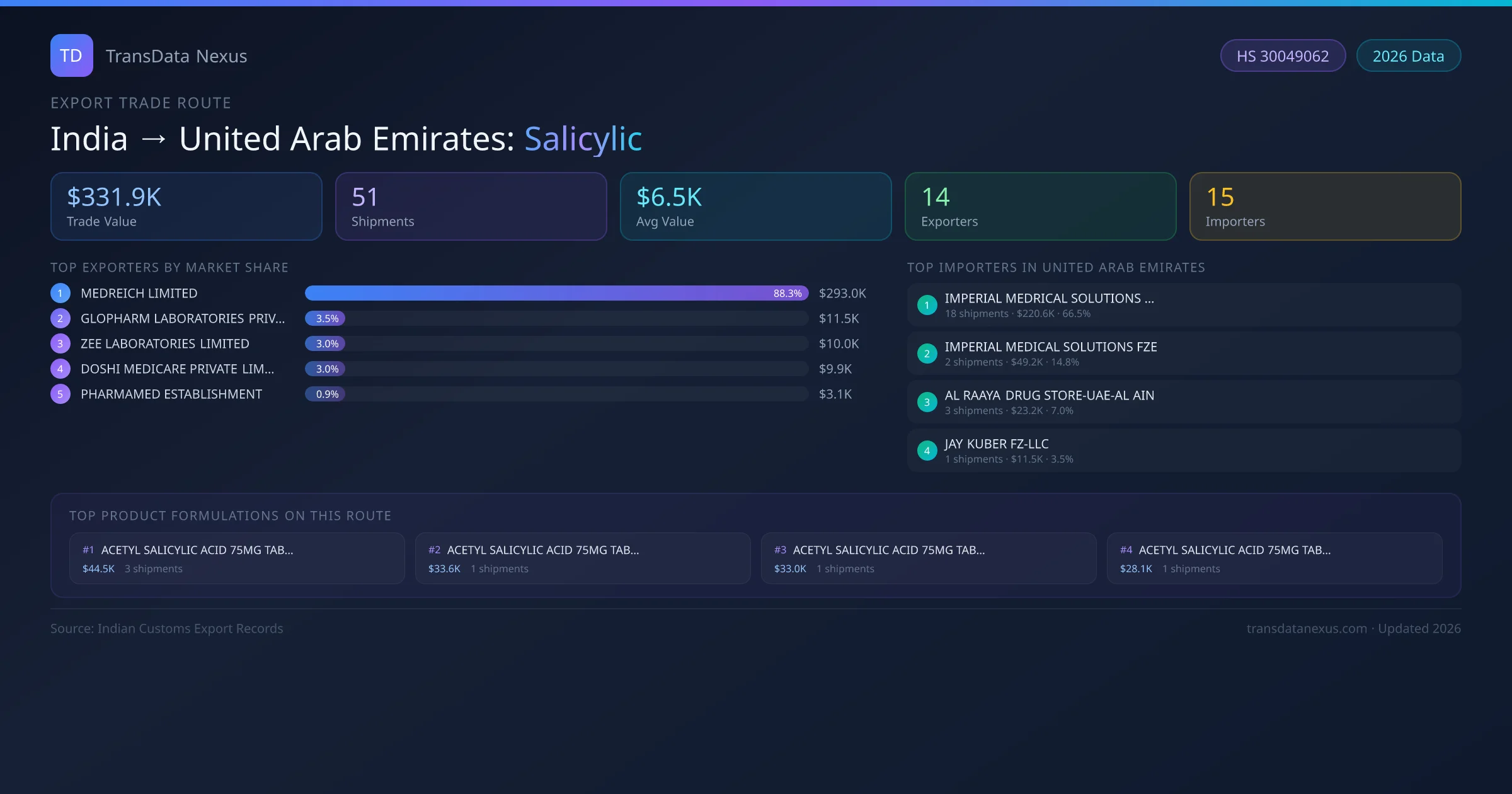The India to United Arab Emirates Salicylic corridor is one of India's established pharmaceutical export routes, with 51 shipments documented worth a combined $331.9K USD. The route is dominated by MEDREICH LIMITED, which alone accounts for roughly 88% of all export value, reflecting the consolidated nature of India's salicylic manufacturing sector.