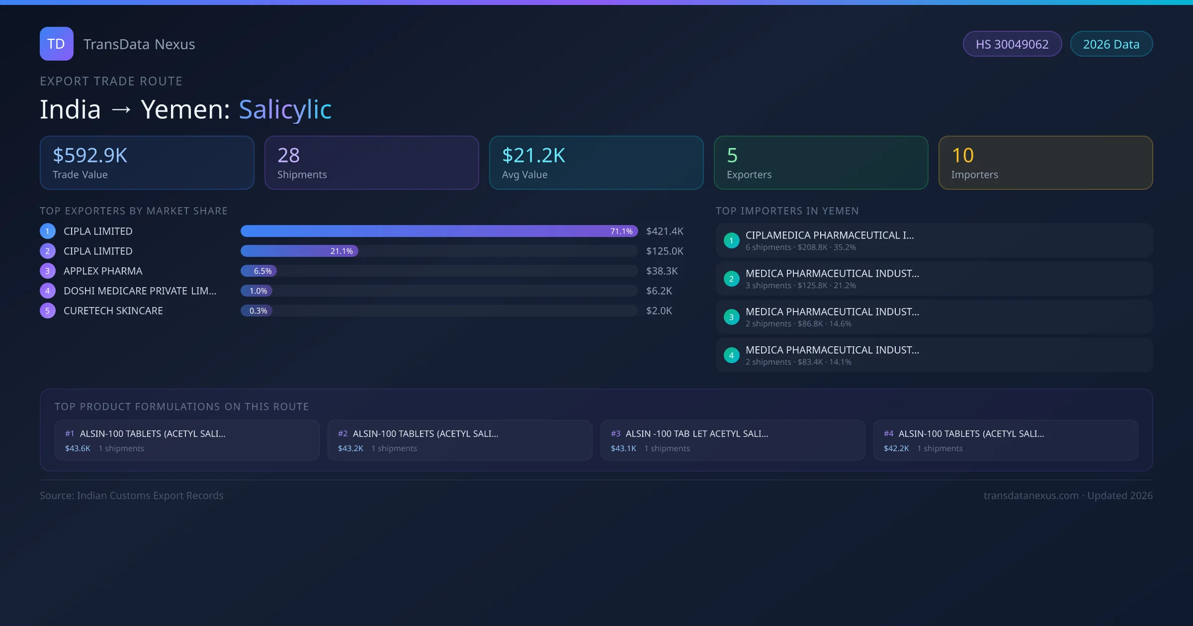 The India to Yemen Salicylic corridor is one of India's established pharmaceutical export routes, with 28 shipments documented worth a combined $592.9K USD. The route is dominated by CIPLA LIMITED, which alone accounts for roughly 71% of all export value, reflecting the consolidated nature of India's salicylic manufacturing sector.