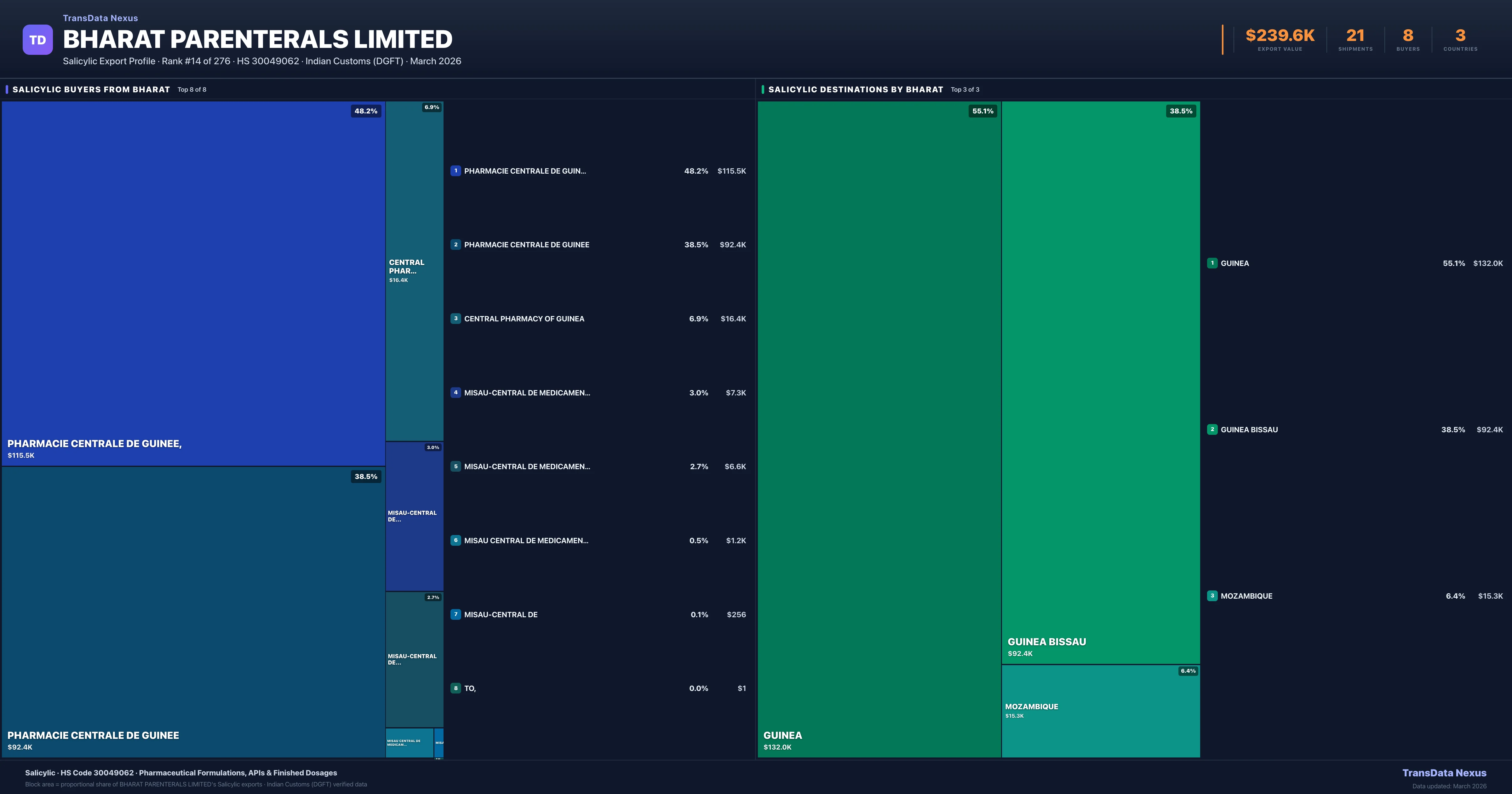 Bharat Parenterals Limited supplies Salicylic to 8 buyers globally. The largest buyer is PHARMACIE CENTRALE DE GUINEE, (GUINEA), followed by PHARMACIE CENTRALE DE GUINEE (GUINEA BISSAU) and CENTRAL PHARMACY OF GUINEA (GUINEA). These buyers represent pharmaceutical distributors, hospital groups, and government procurement agencies in their respective markets.
