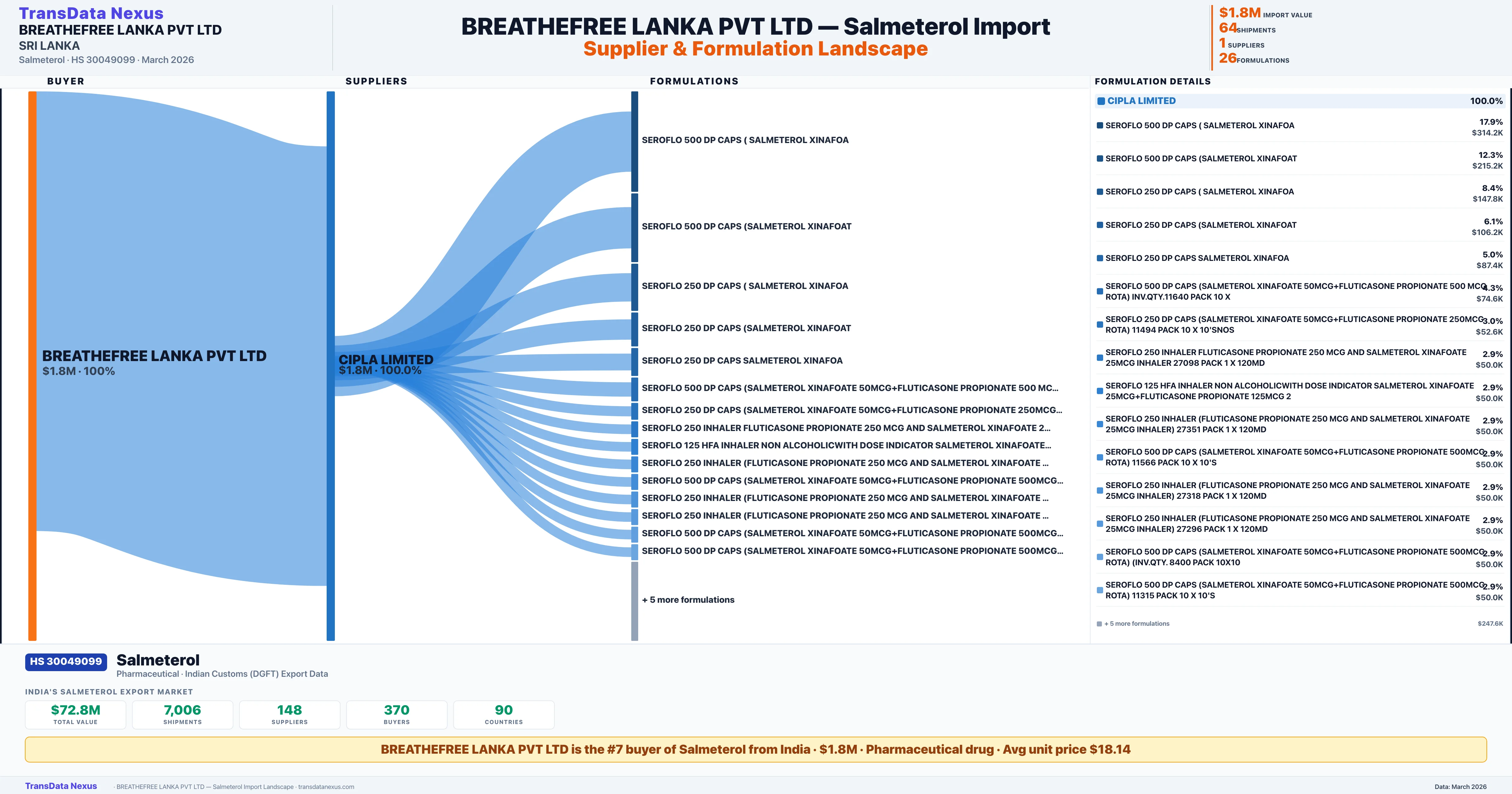 BREATHEFREE LANKA PVT LTD sources Salmeterol from 1 verified Indian supplier: CIPLA LIMITED ($1.8M, 100.0%). This is based on 64 customs records.