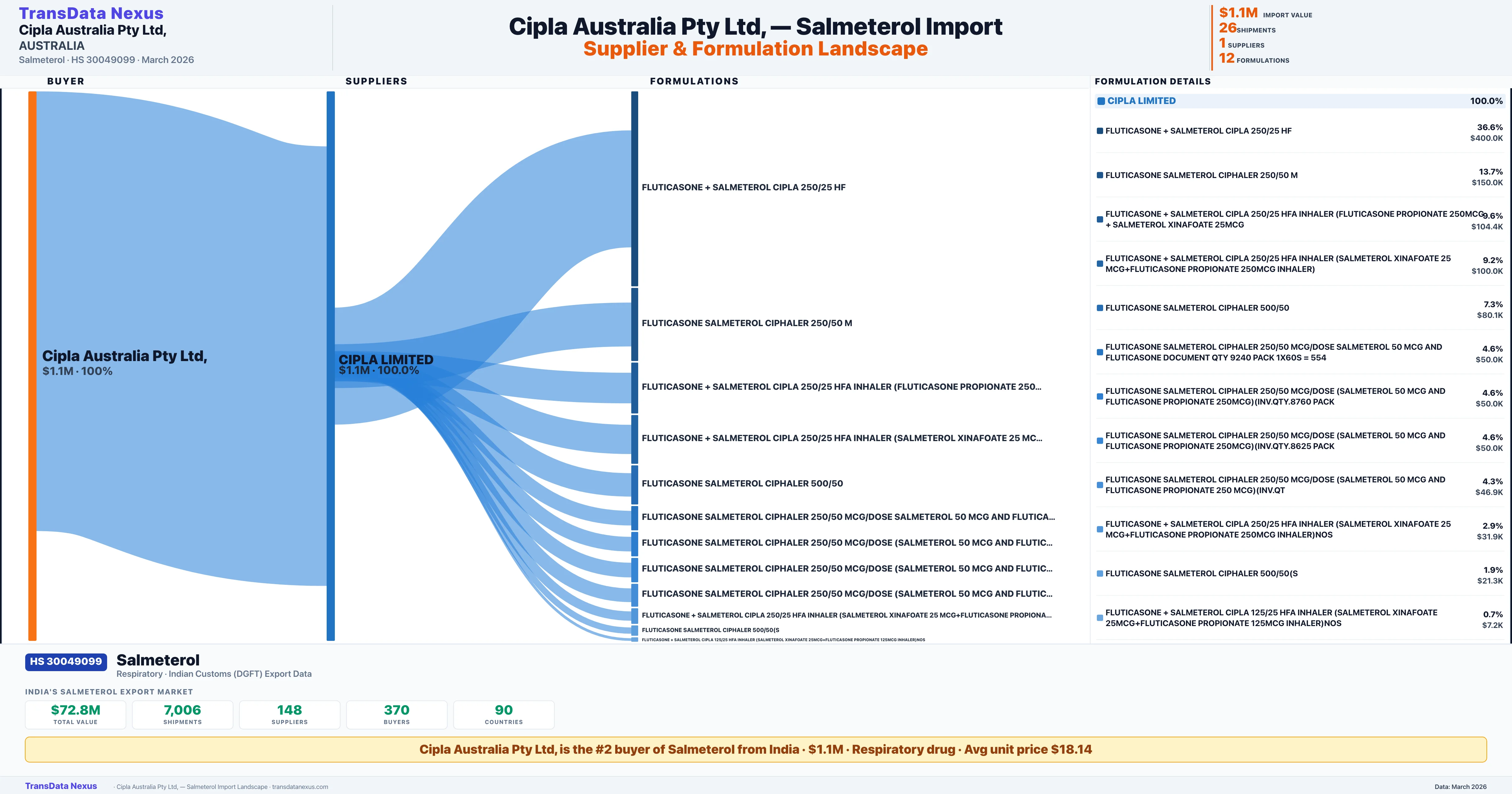 CIPLA AUSTRALIA PTY LTD, sources Salmeterol from 1 verified Indian supplier: CIPLA LIMITED ($1.1M, 100.0%). This is based on 26 customs records.