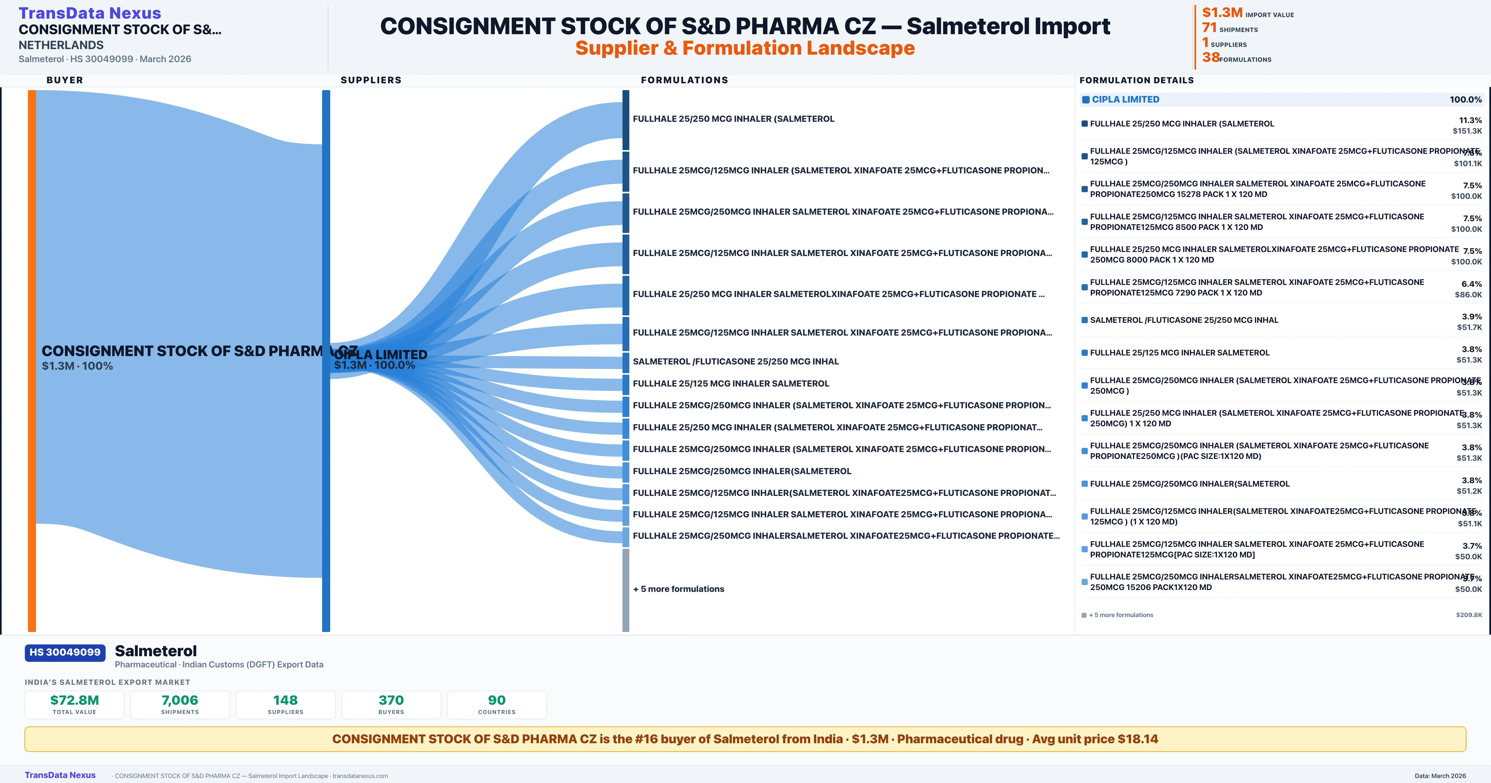 CONSIGNMENT STOCK OF S&D PHARMA CZ sources Salmeterol from 1 verified Indian supplier: CIPLA LIMITED ($1.3M, 100.0%). This is based on 71 customs records.