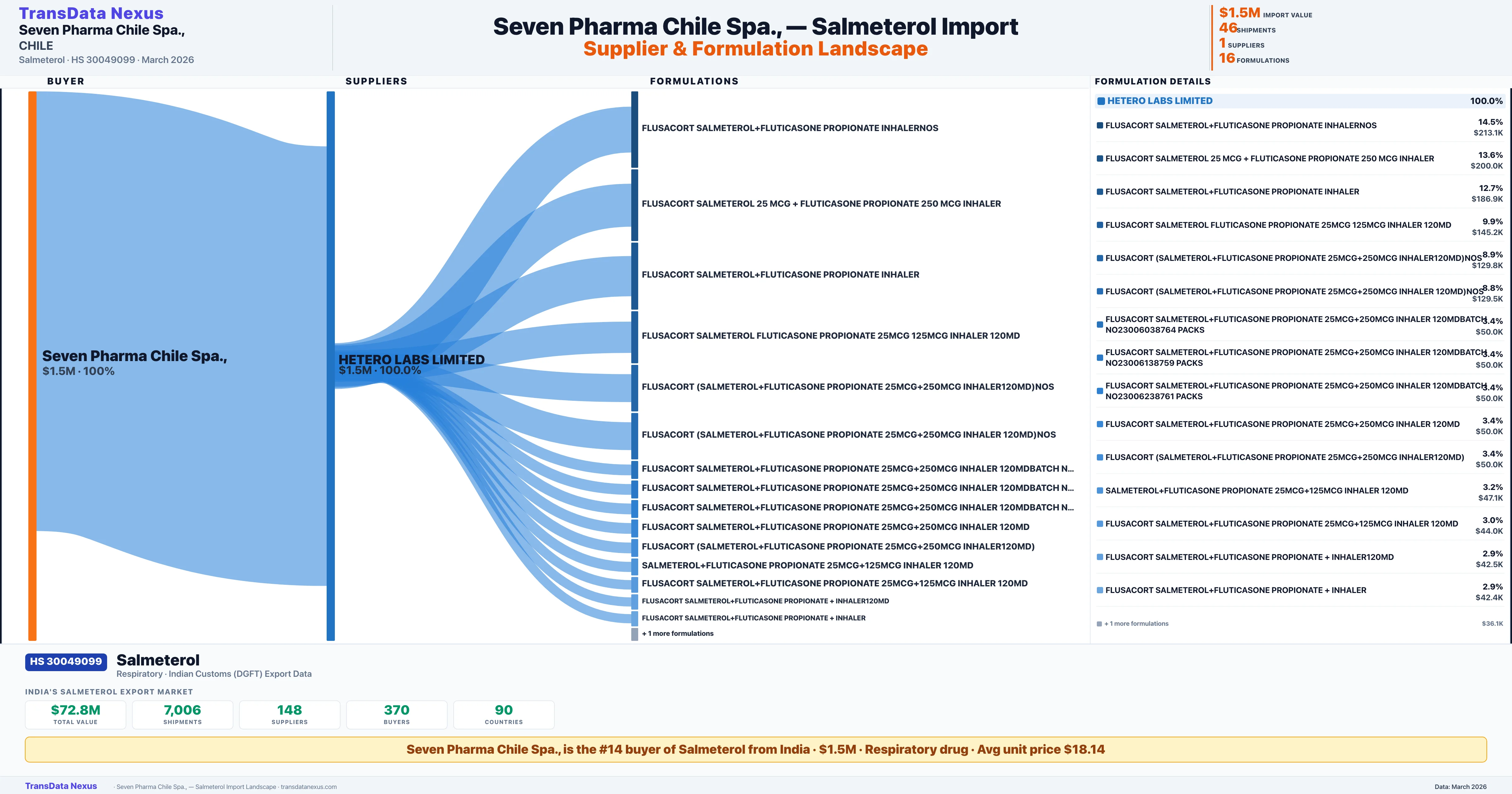 SEVEN PHARMA CHILE SPA sources Salmeterol from 1 verified Indian supplier: HETERO LABS LIMITED ($1.5M, 100.0%). This is based on 46 customs records.