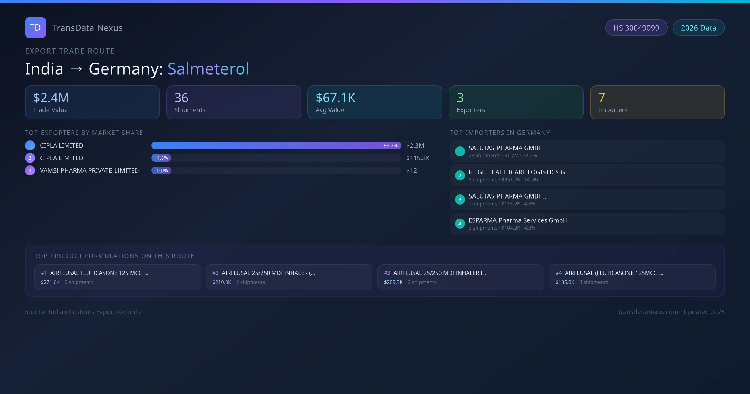 - 1.Route Identification: India to Germany export trade corridor identified from Indian Customs (DGFT) records for Salmeterol.
