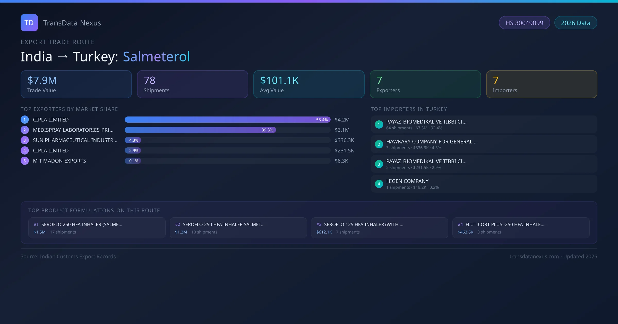 - 1.Route Identification: India to Turkey export trade corridor identified from Indian Customs (DGFT) records for Salmeterol.
