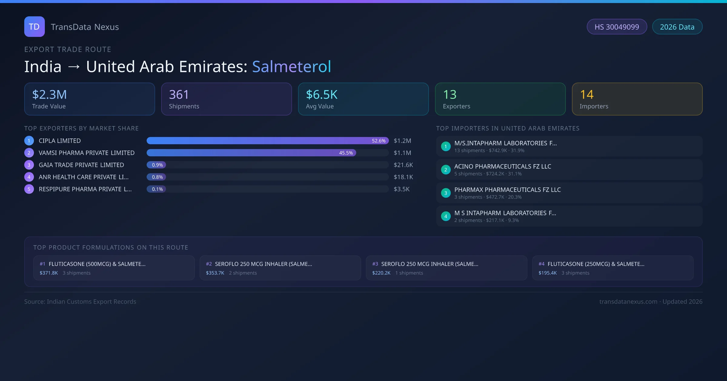 - 1.Route Identification: India to United Arab Emirates export trade corridor identified from Indian Customs (DGFT) records for Salmeterol.