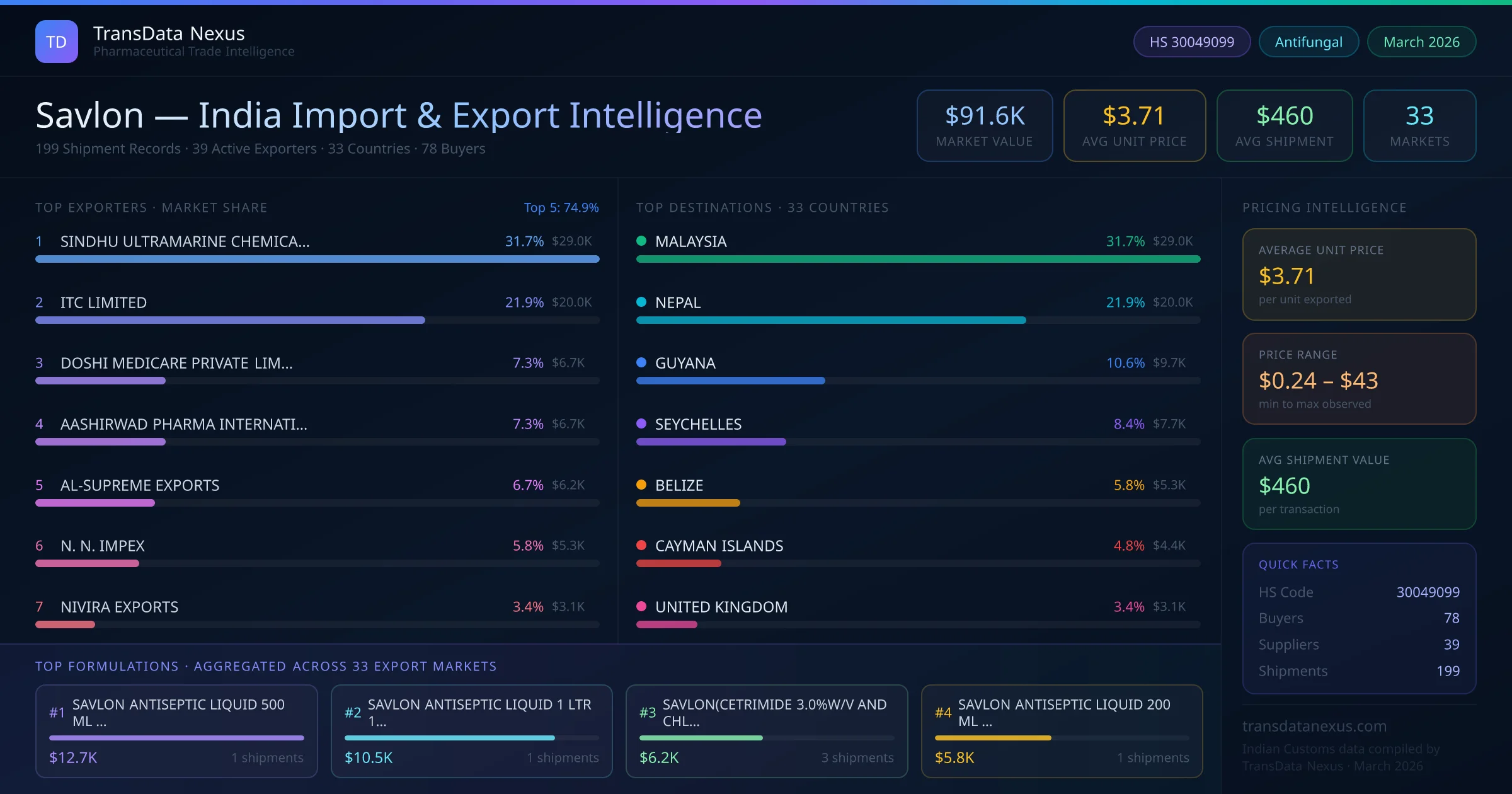The total export value of savlon from India is $91.6K, recorded across 199 shipments from 39 active exporters to 33 countries. The average shipment value is $460.