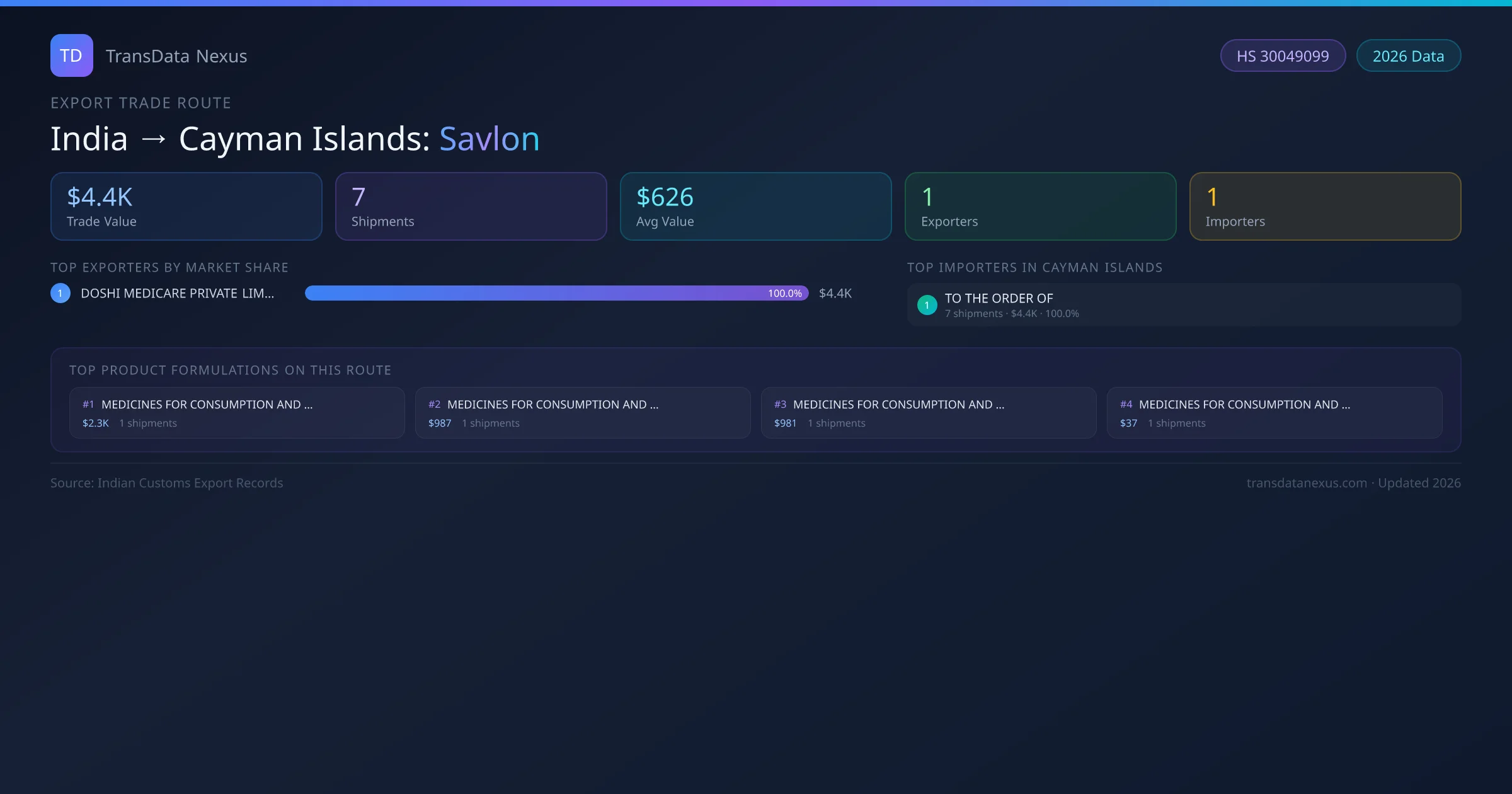 - 1.Route Identification: India to Cayman Islands export trade corridor identified from Indian Customs (DGFT) records for Savlon.