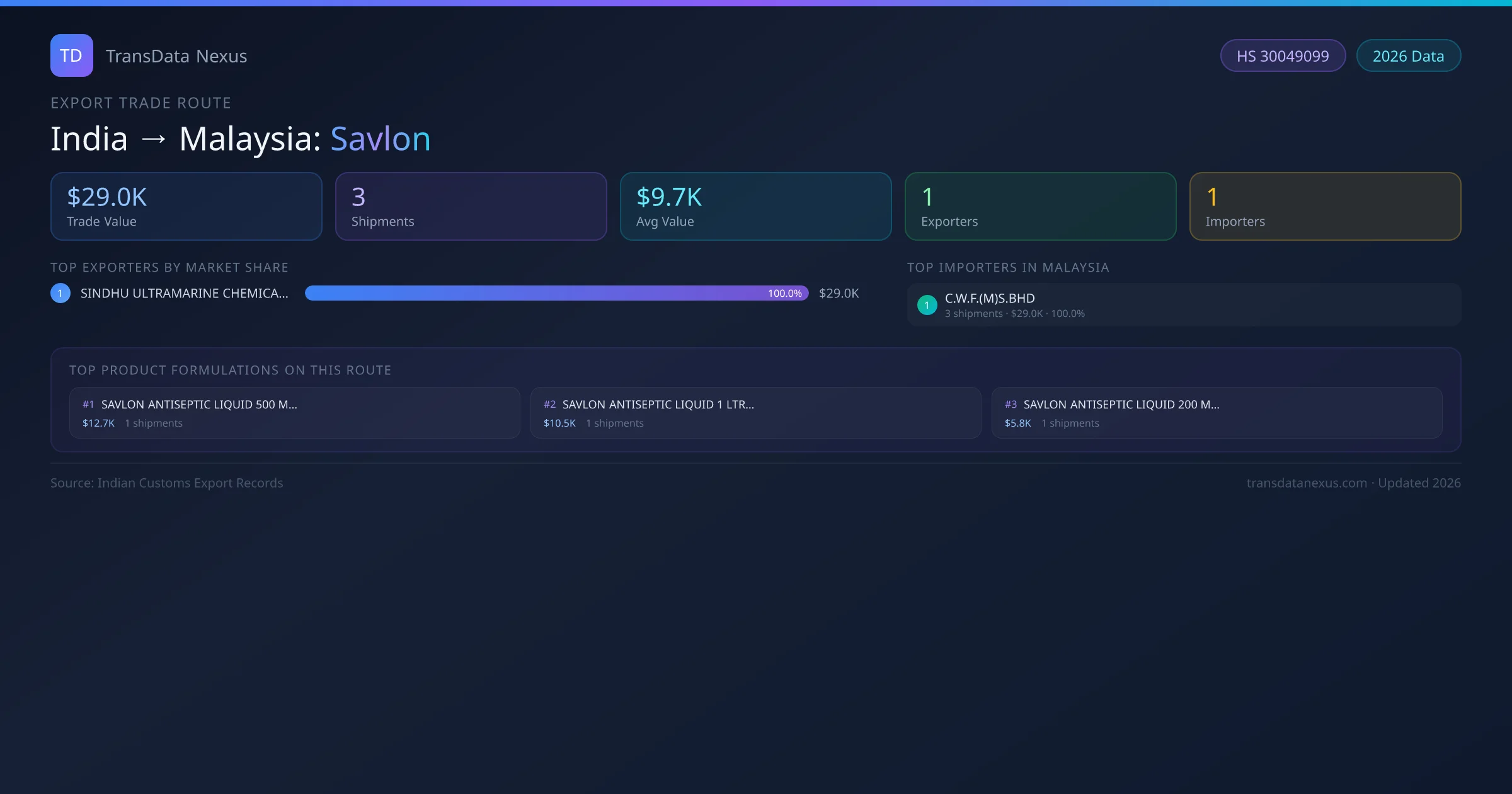 India exports Savlon to Malaysia worth approximately $29.0K USD across 3 recorded shipments. The average value per shipment is $9.7K USD.