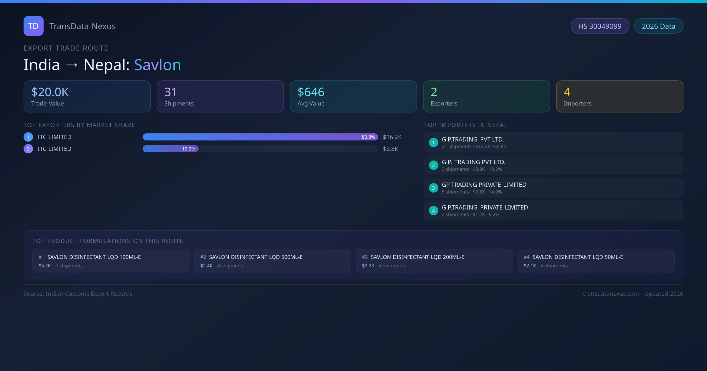 The India to Nepal Savlon corridor is one of India's established pharmaceutical export routes, with 31 shipments documented worth a combined $20.0K USD. The route is dominated by ITC LIMITED, which alone accounts for roughly 81% of all export value, reflecting the consolidated nature of India's savlon manufacturing sector.