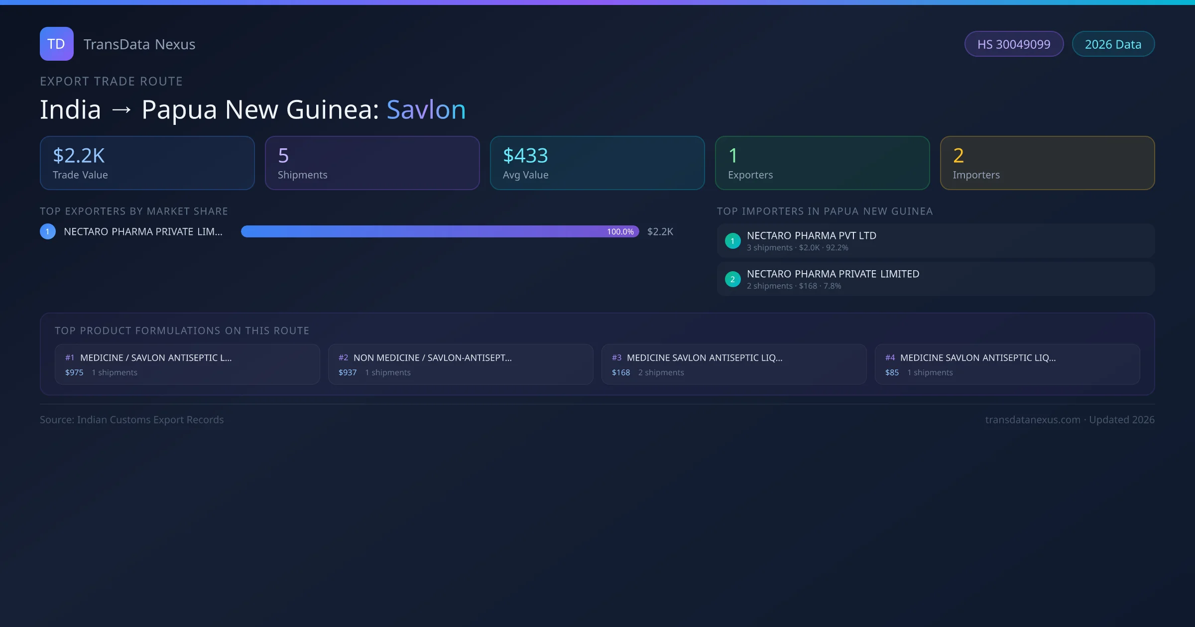The India to Papua New Guinea Savlon corridor is one of India's established pharmaceutical export routes, with 5 shipments documented worth a combined $2.2K USD. The route is dominated by NECTARO PHARMA PRIVATE LIMITED, which alone accounts for roughly 100% of all export value, reflecting the consolidated nature of India's savlon manufacturing sector.
