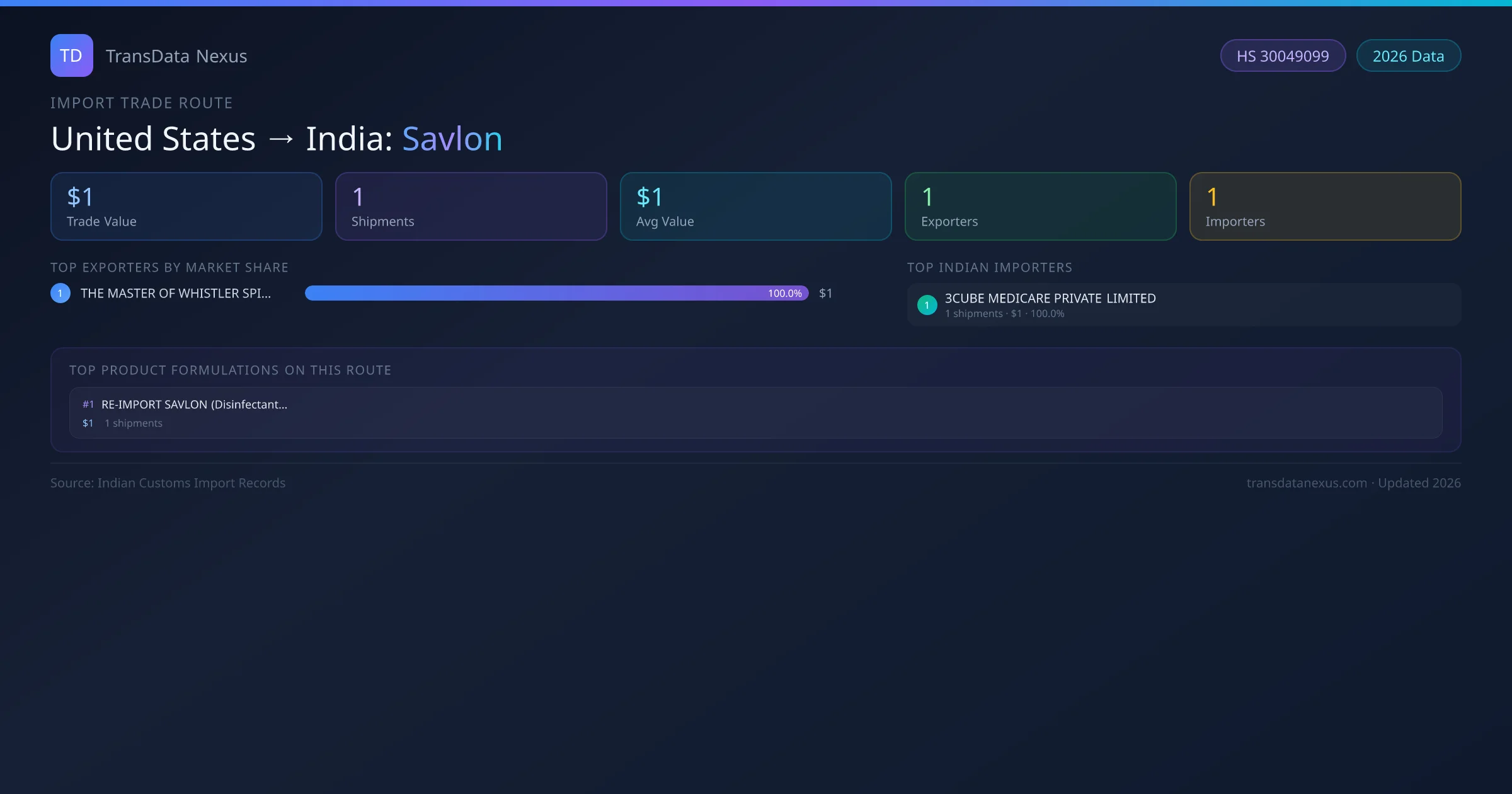 On the buying side, 3CUBE MEDICARE PRIVATE LIMITED is the largest importer with 1 shipments worth $1 USD — representing 100% of all savlon imports from United States on this route.