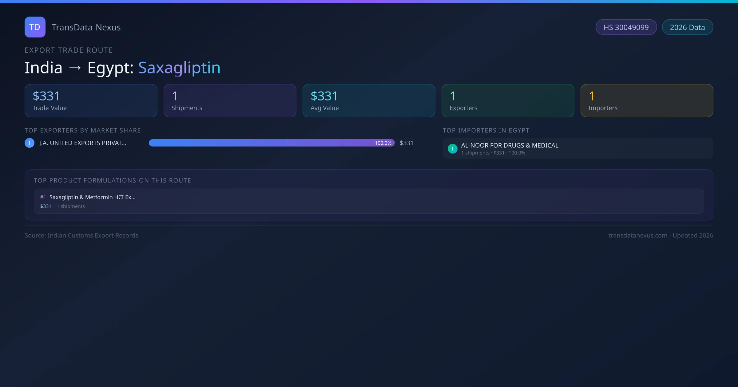 The India to Egypt Saxagliptin corridor is one of India's established pharmaceutical export routes, with 1 shipments documented worth a combined $331 USD. The route is dominated by J.A. UNITED EXPORTS PRIVATE LIMITED, which alone accounts for roughly 100% of all export value, reflecting the consolidated nature of India's saxagliptin manufacturing sector.