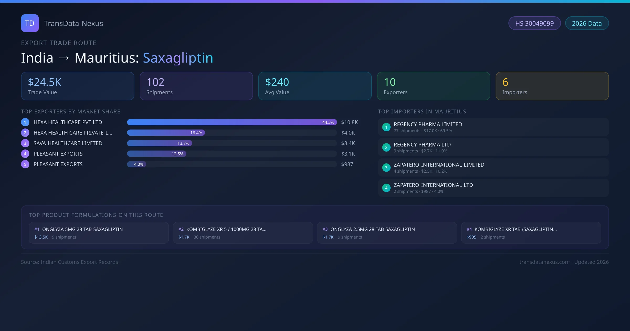 The India to Mauritius Saxagliptin corridor is one of India's established pharmaceutical export routes, with 102 shipments documented worth a combined $24.5K USD. The route is dominated by HEXA HEALTHCARE PVT LTD, which alone accounts for roughly 44% of all export value, reflecting the consolidated nature of India's saxagliptin manufacturing sector.