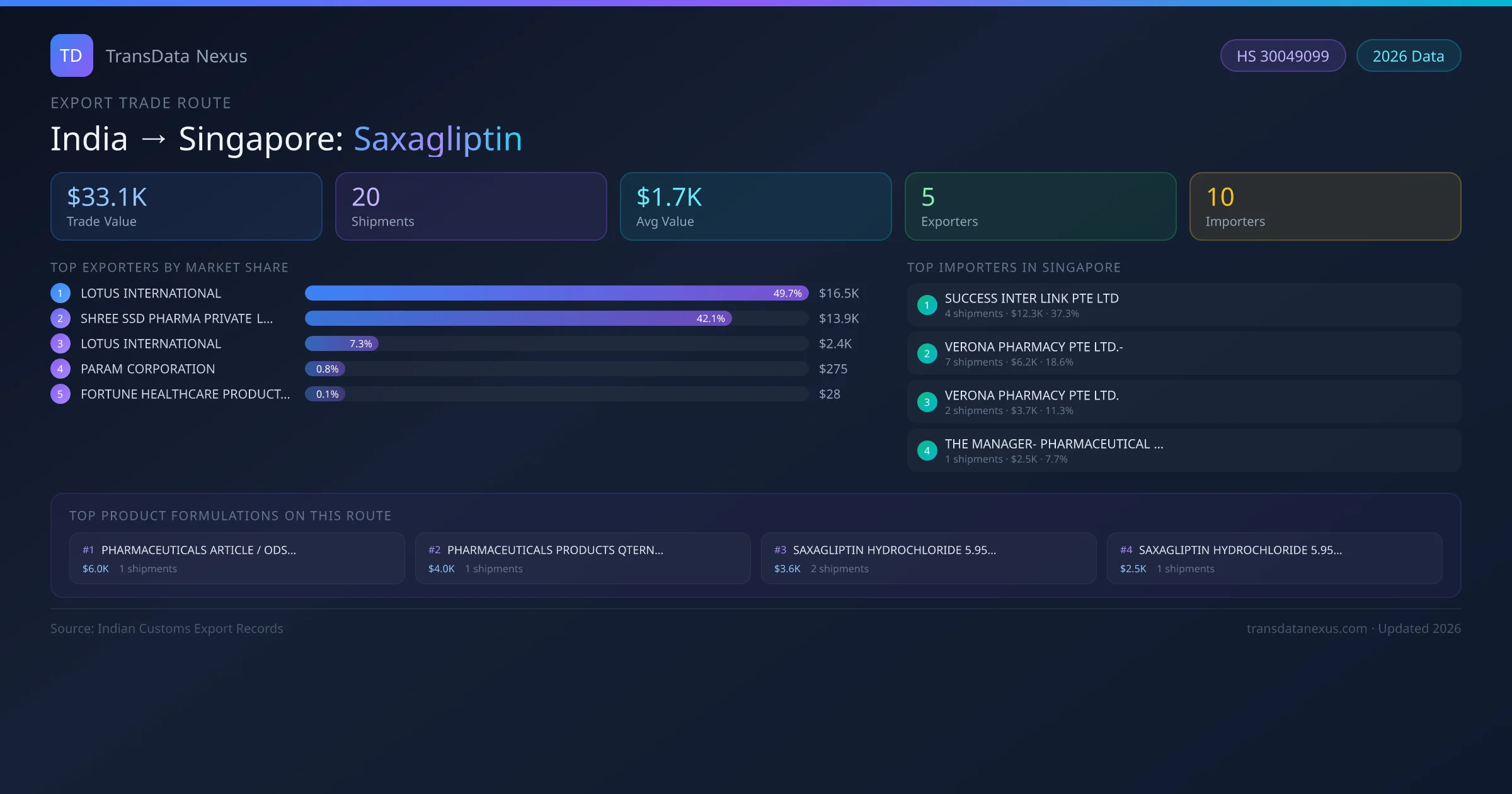 India has recorded 20 verified shipments of Saxagliptin exported to Singapore, representing a combined trade value of $33.1K USD. This corridor is served by 5 active Indian exporters, with an average shipment value of $1.7K USD. The leading Indian exporter is LOTUS INTERNATIONAL, which accounts for 50% of total export value with 12 shipments worth $16.5K USD. On the buying side, SUCCESS INTER LINK PTE LTD is the largest importer in Singapore with $12.3K USD in purchases. The top 3 suppliers — LOTUS INTERNATIONAL, SHREE SSD PHARMA PRIVATE LIMITED, LOTUS INTERNATIONAL — together control 99% of total trade value on this route. All data sourced from Indian Customs (DGFT) shipping bill records. Values reported in FOB USD.