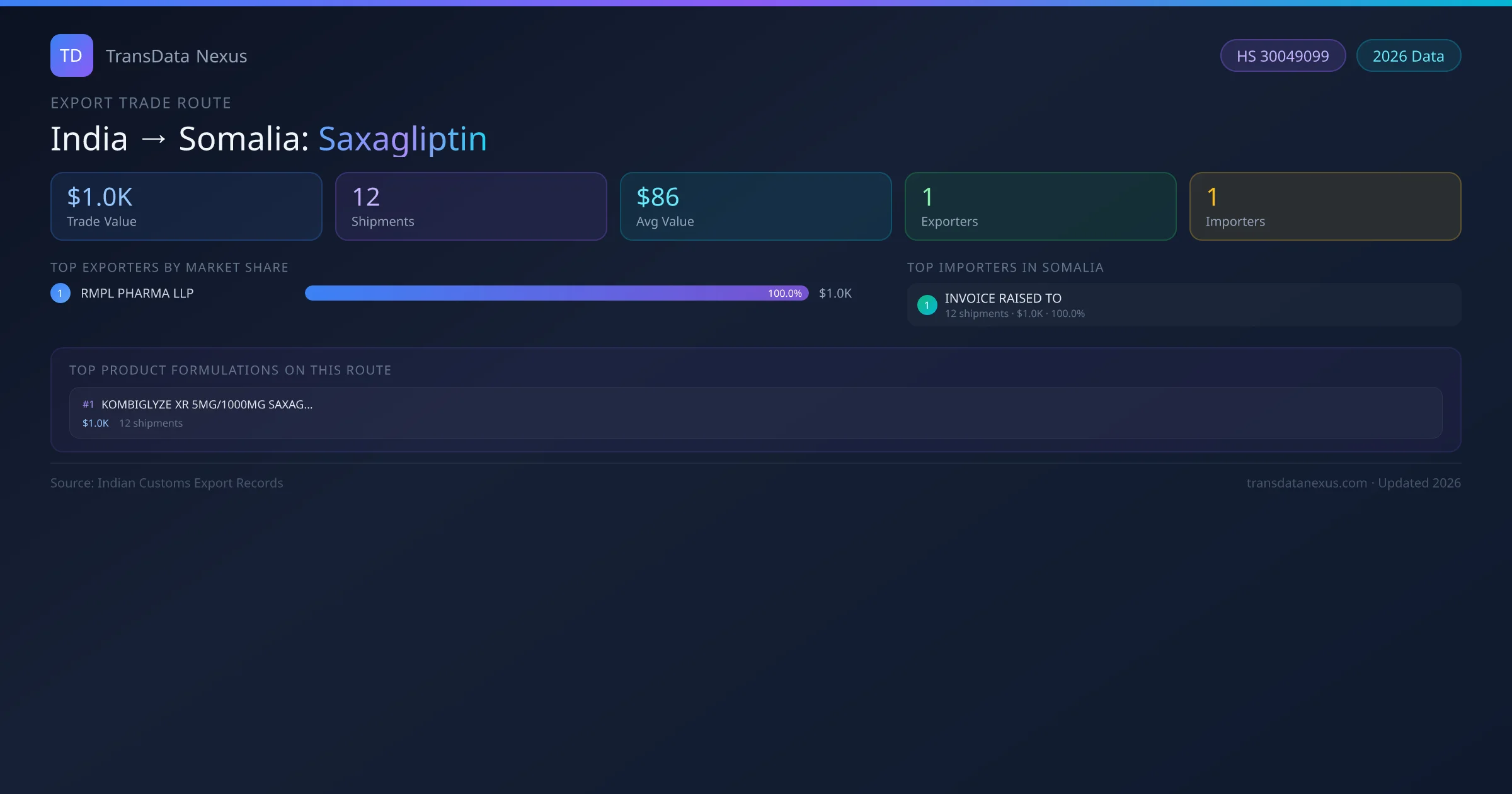 The India to Somalia Saxagliptin corridor is one of India's established pharmaceutical export routes, with 12 shipments documented worth a combined $1.0K USD. The route is dominated by RMPL PHARMA LLP, which alone accounts for roughly 100% of all export value, reflecting the consolidated nature of India's saxagliptin manufacturing sector.
