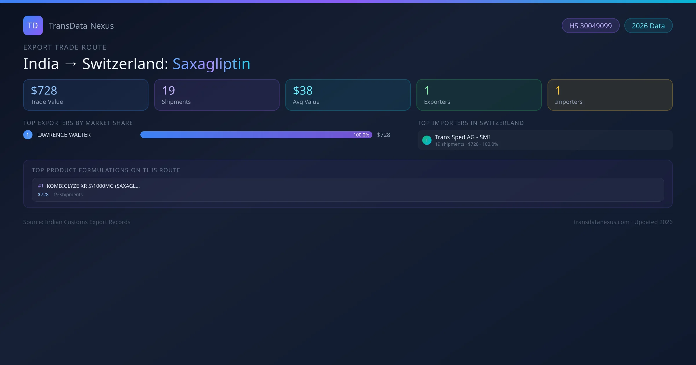 The India to Switzerland Saxagliptin corridor is one of India's established pharmaceutical export routes, with 19 shipments documented worth a combined $728 USD. The route is dominated by LAWRENCE WALTER , which alone accounts for roughly 100% of all export value, reflecting the consolidated nature of India's saxagliptin manufacturing sector.