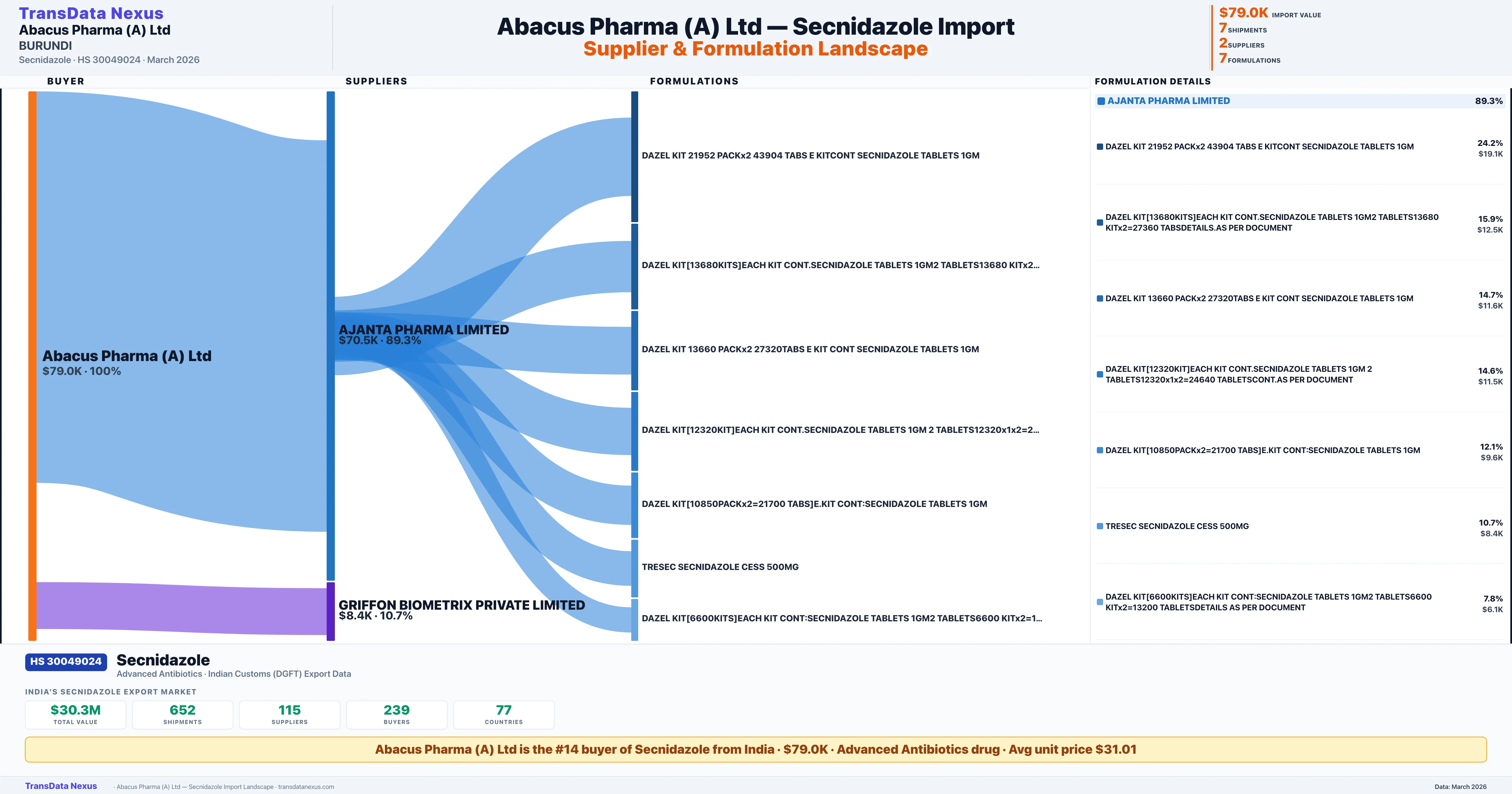 ABACUS PHARMA (A) LTD sources Secnidazole from 2 verified Indian suppliers: AJANTA PHARMA LIMITED ($70.5K, 89.3%), GRIFFON BIOMETRIX PRIVATE LIMITED ($8.4K, 10.7%). This is based on 7 customs records.
