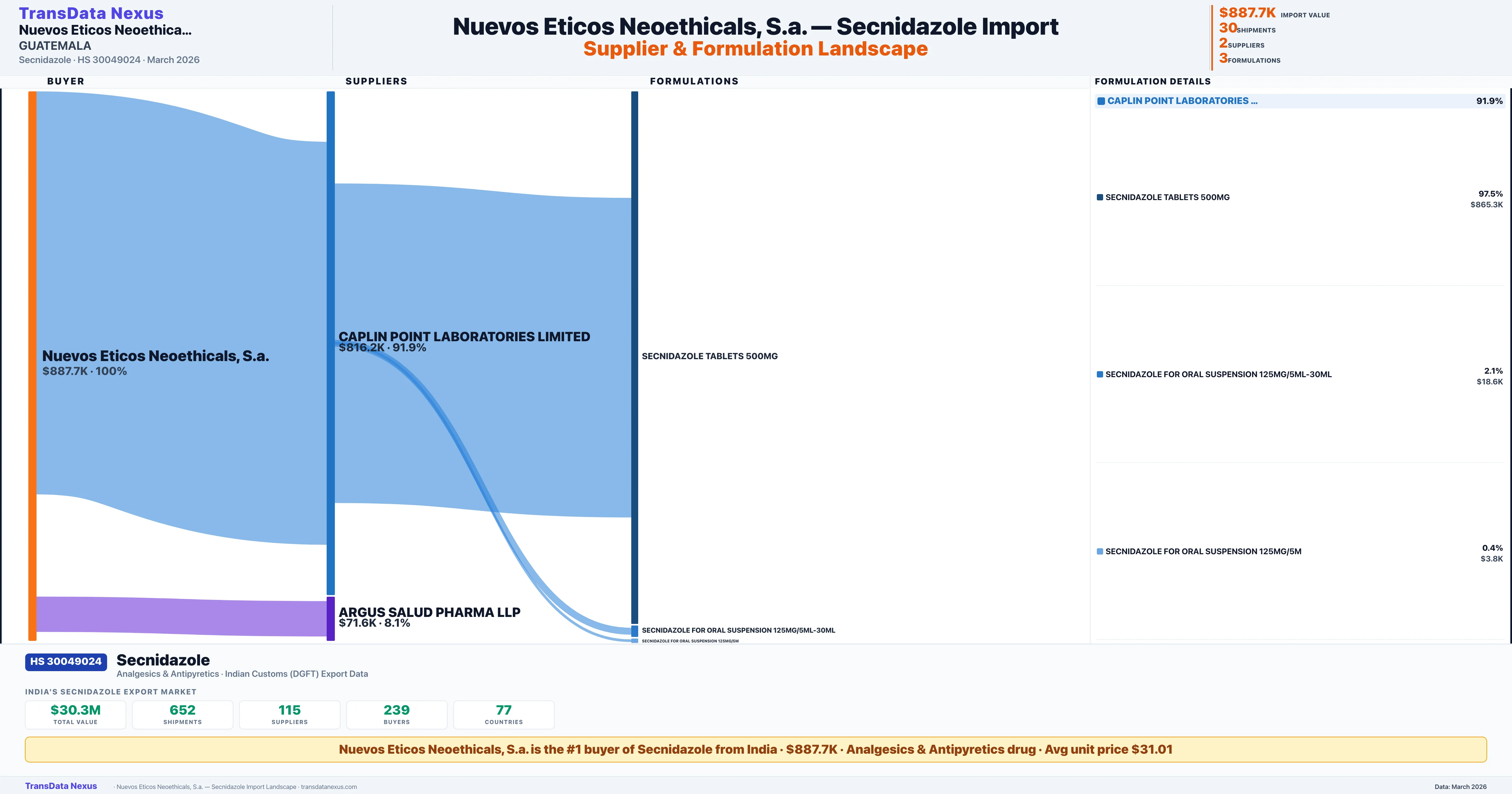 NUEVOS ETICOS NEOETHICALS, S.A. sources Secnidazole from 2 verified Indian suppliers: CAPLIN POINT LABORATORIES LIMITED ($816.2K, 91.9%), ARGUS SALUD PHARMA LLP ($71.6K, 8.1%). This is based on 30 customs records.