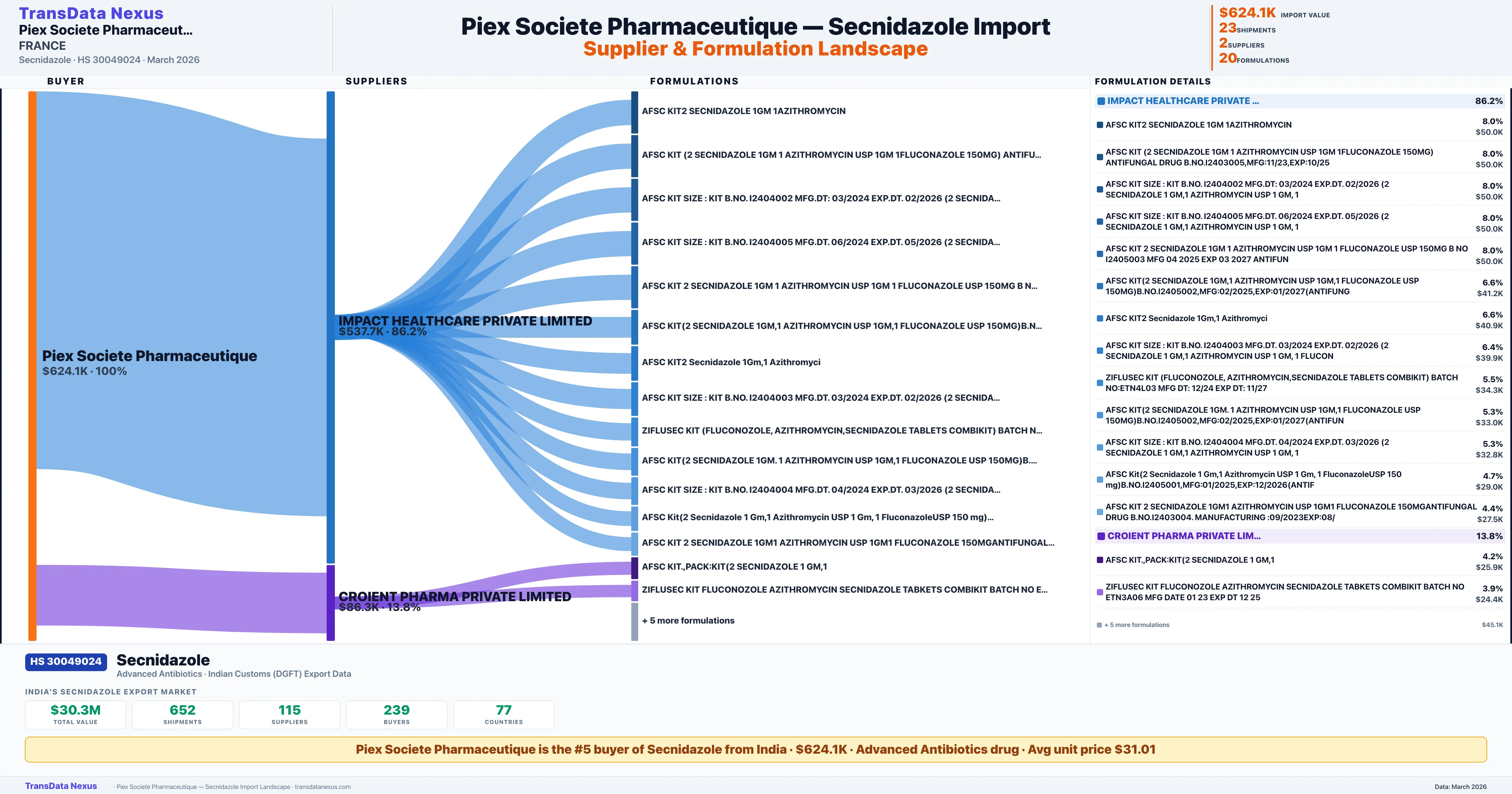 PIEX SOCIETE PHARMACEUTIQUE sources Secnidazole from 2 verified Indian suppliers: IMPACT HEALTHCARE PRIVATE LIMITED ($537.7K, 86.2%), CROIENT PHARMA PRIVATE LIMITED ($86.3K, 13.8%). This is based on 23 customs records.