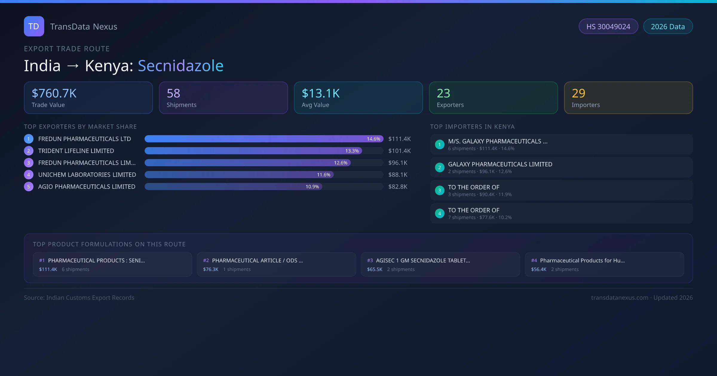 - 1.Route Identification: India to Kenya export trade corridor identified from Indian Customs (DGFT) records for Secnidazole.