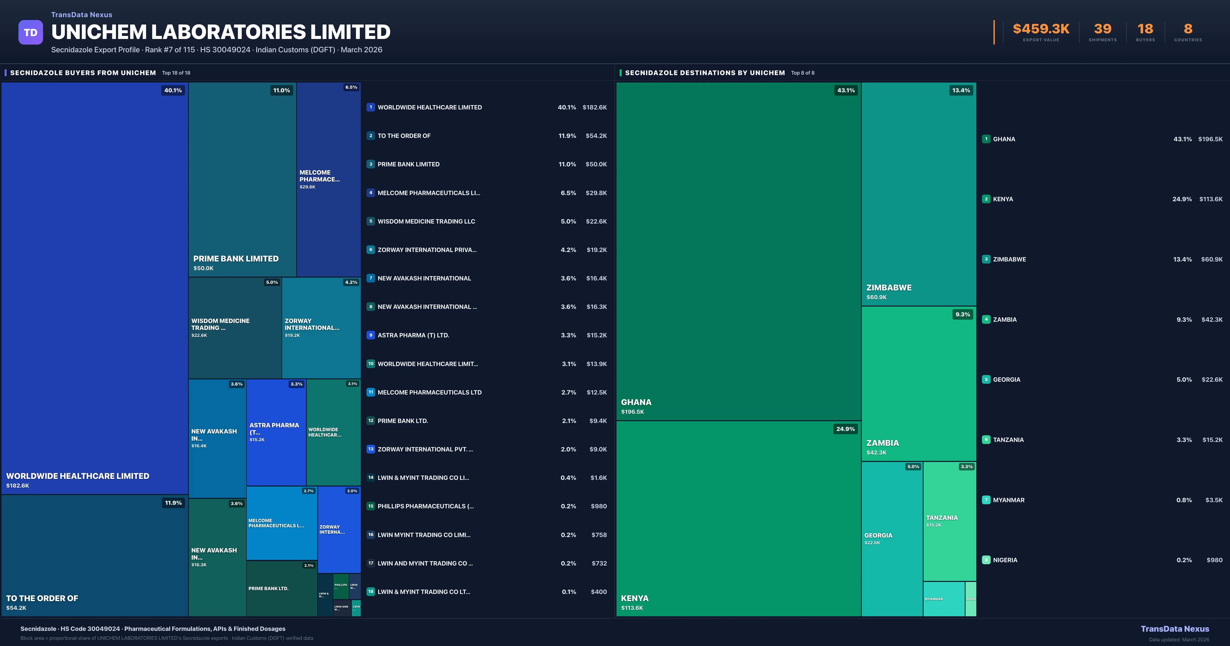 Unichem Laboratories Limited supplies Secnidazole to 18 buyers globally. The largest buyer is WORLDWIDE HEALTHCARE LIMITED (GHANA), followed by TO THE ORDER OF (KENYA) and PRIME BANK LIMITED (KENYA). These buyers represent pharmaceutical distributors, hospital groups, and government procurement agencies in their respective markets.