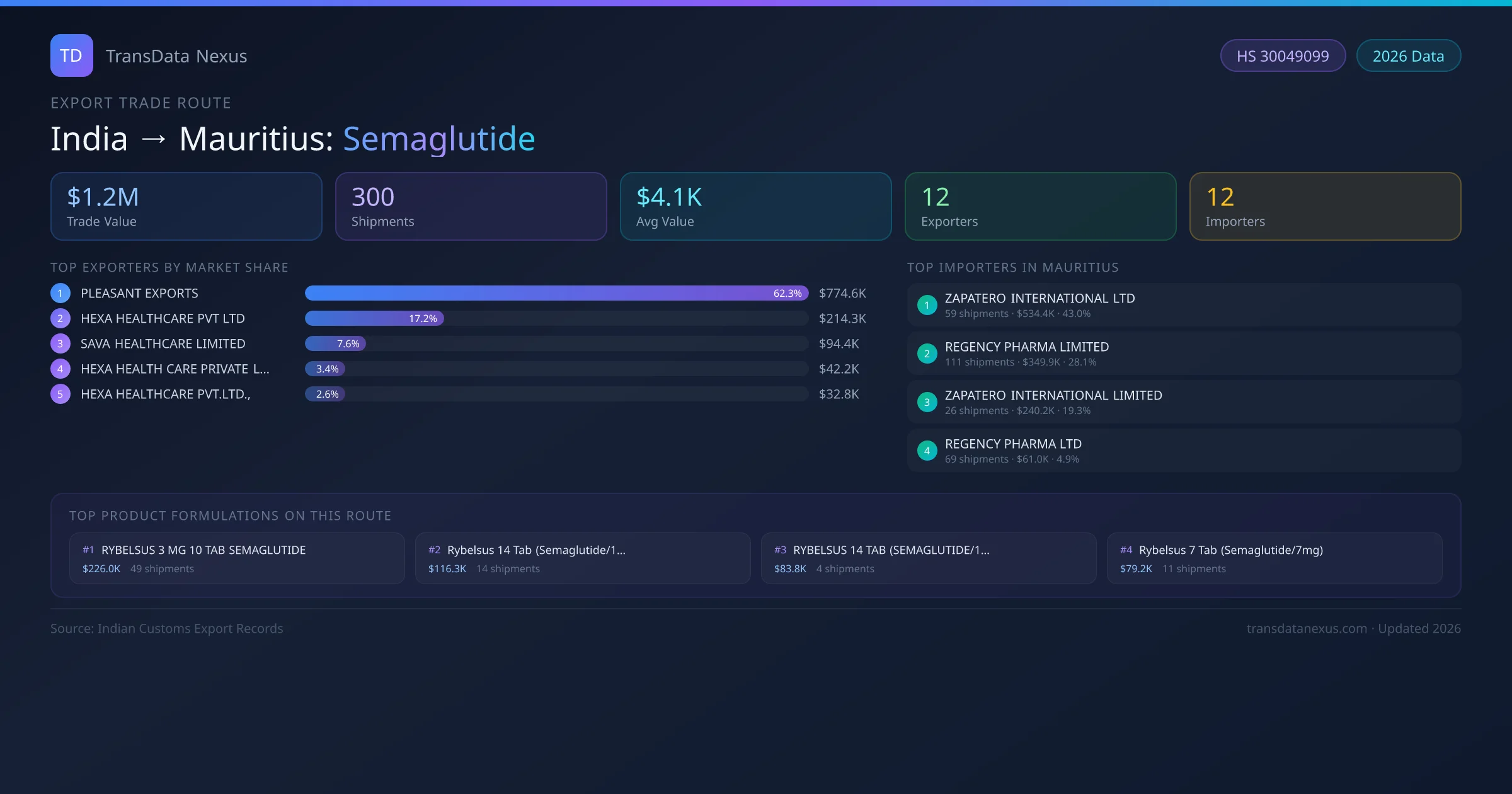 India exports Semaglutide to Mauritius worth approximately $1.2M USD across 300 recorded shipments. The average value per shipment is $4.1K USD.