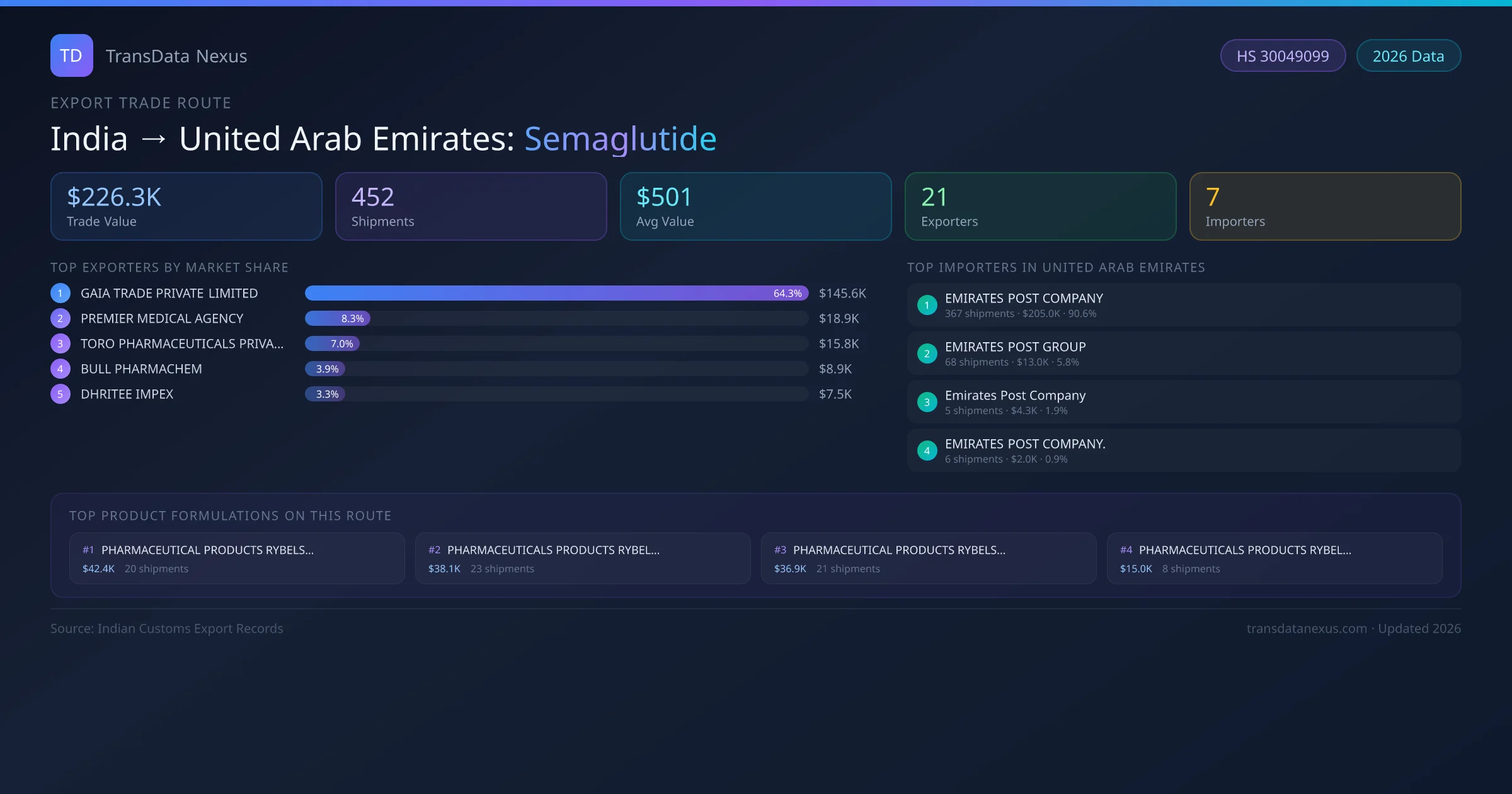 The India to United Arab Emirates Semaglutide corridor is one of India's established pharmaceutical export routes, with 452 shipments documented worth a combined $226.3K USD. The route is dominated by GAIA TRADE PRIVATE LIMITED, which alone accounts for roughly 64% of all export value, reflecting the consolidated nature of India's semaglutide manufacturing sector.