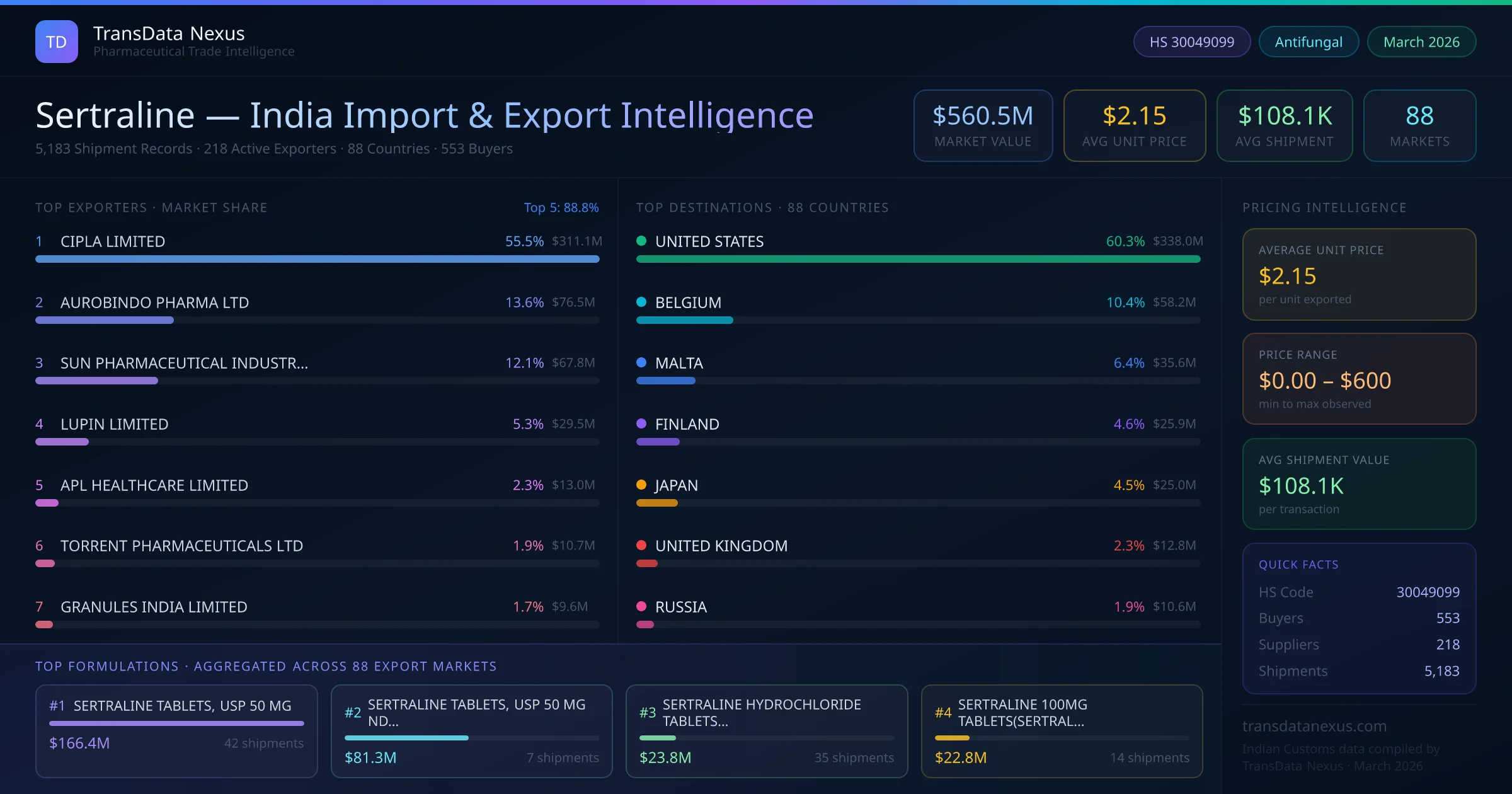 The total export value of sertraline from India is $560.5M, recorded across 5,183 shipments from 218 active exporters to 88 countries. The average shipment value is $108.1K.