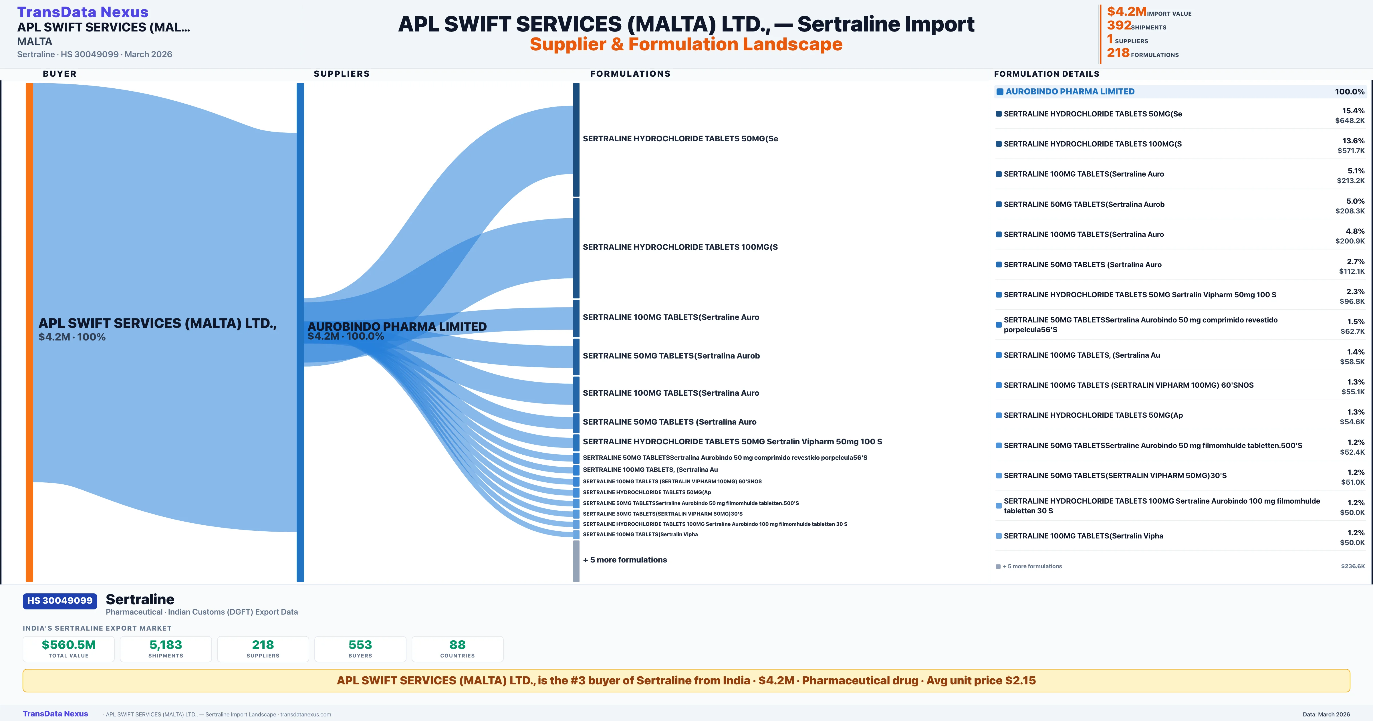 APL SWIFT SERVICES (MALTA) LTD., sources Sertraline from 1 verified Indian supplier: AUROBINDO PHARMA LIMITED ($4.2M, 100.0%). This is based on 392 customs records.