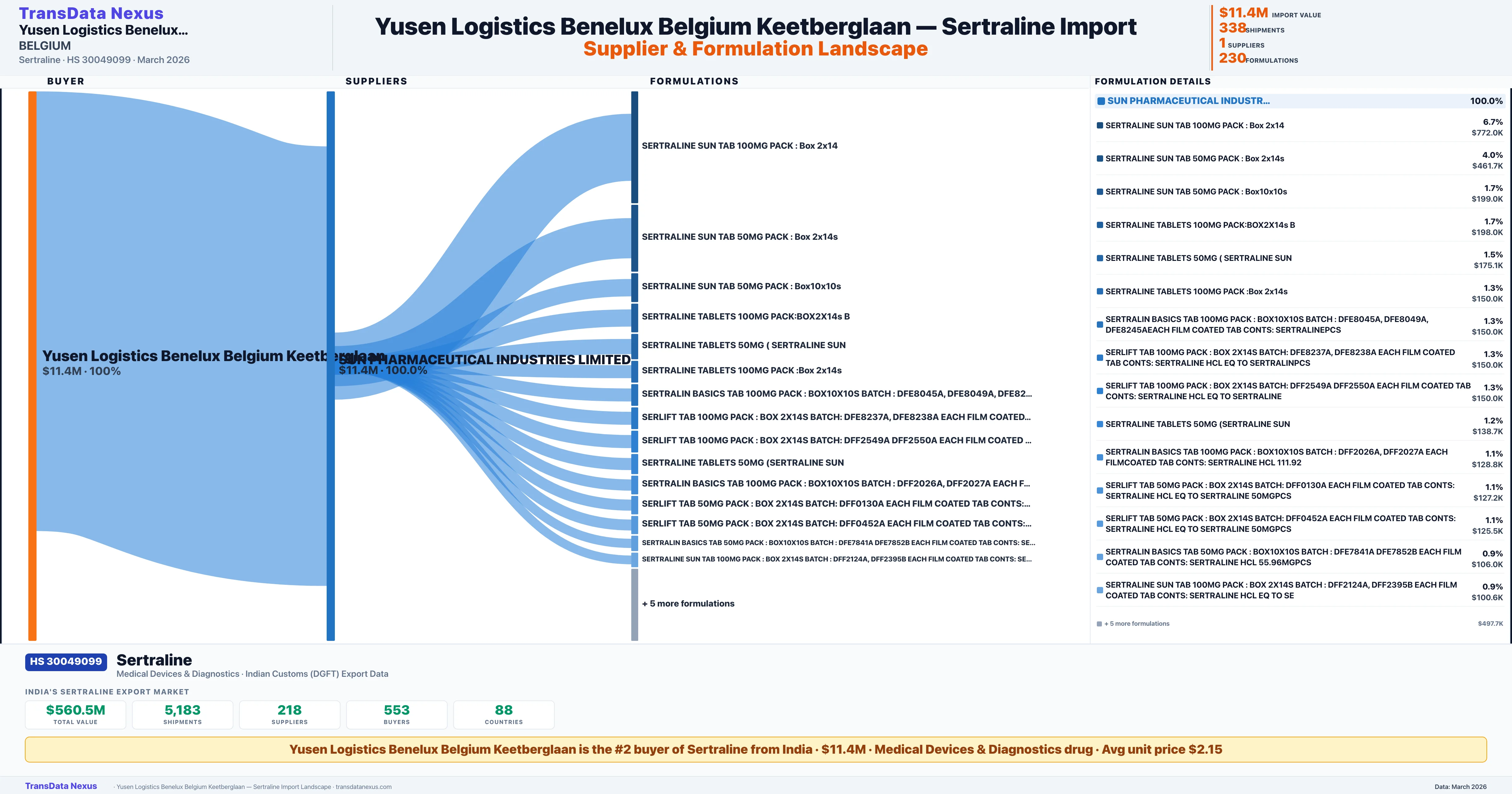 YUSEN LOGISTICS BENELUX BELGIUM KEETBERGLAAN sources Sertraline from 1 verified Indian supplier: SUN PHARMACEUTICAL INDUSTRIES LIMITED ($11.4M, 100.0%). This is based on 338 customs records.