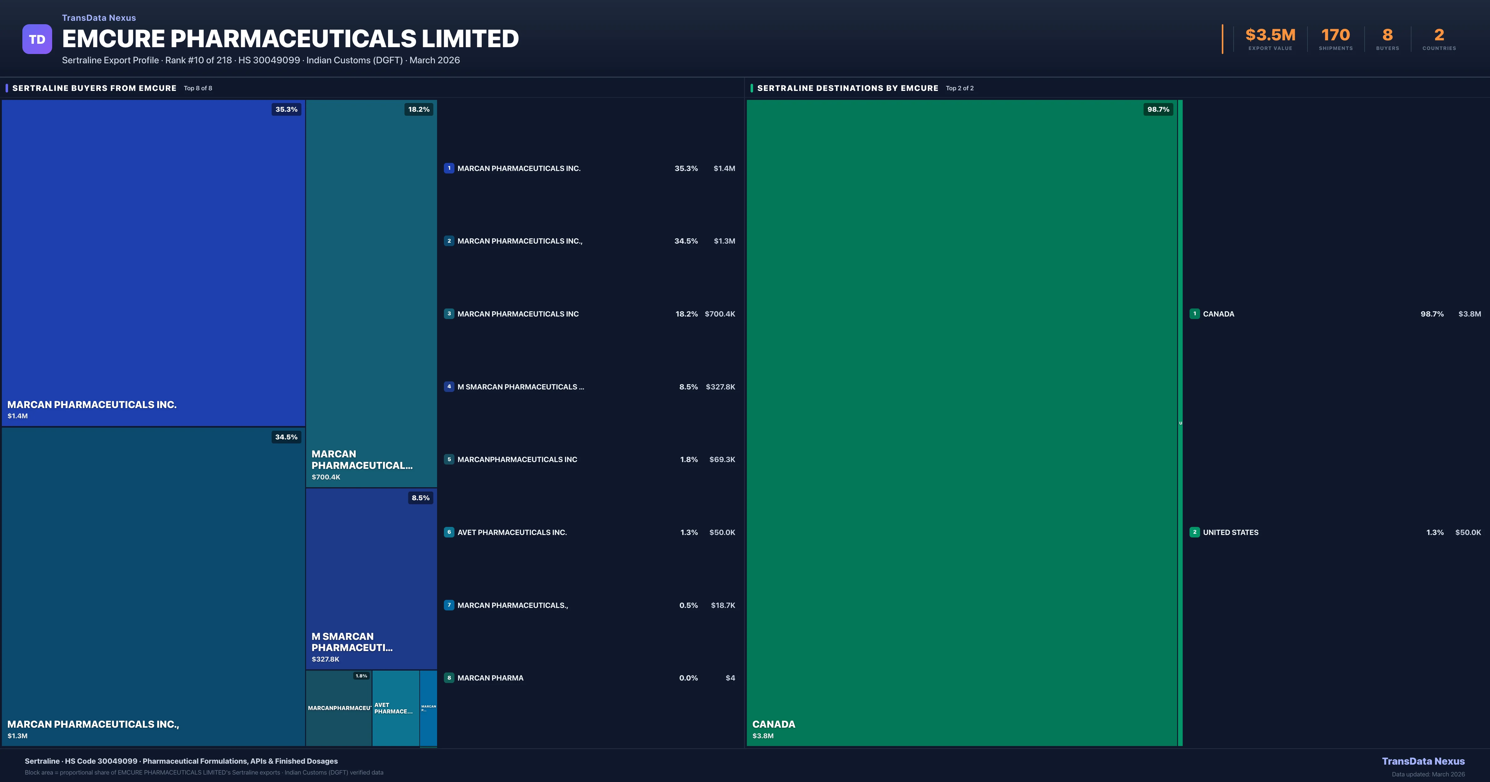 Emcure Pharmaceuticals Limited supplies Sertraline to 8 buyers globally. The largest buyer is MARCAN PHARMACEUTICALS INC. (CANADA), followed by MARCAN PHARMACEUTICALS INC., (CANADA) and MARCAN PHARMACEUTICALS INC (CANADA). These buyers represent pharmaceutical distributors, hospital groups, and government procurement agencies in their respective markets.